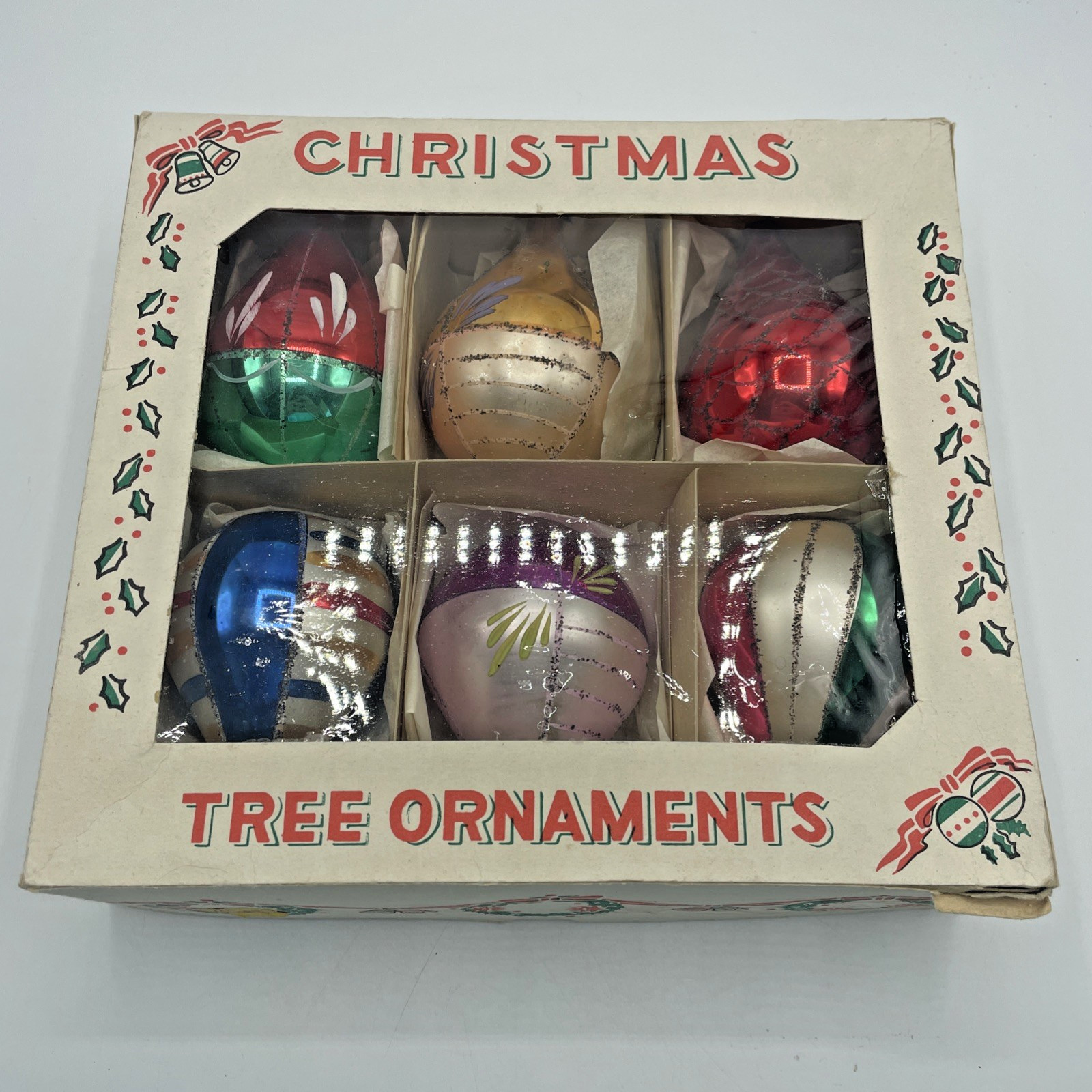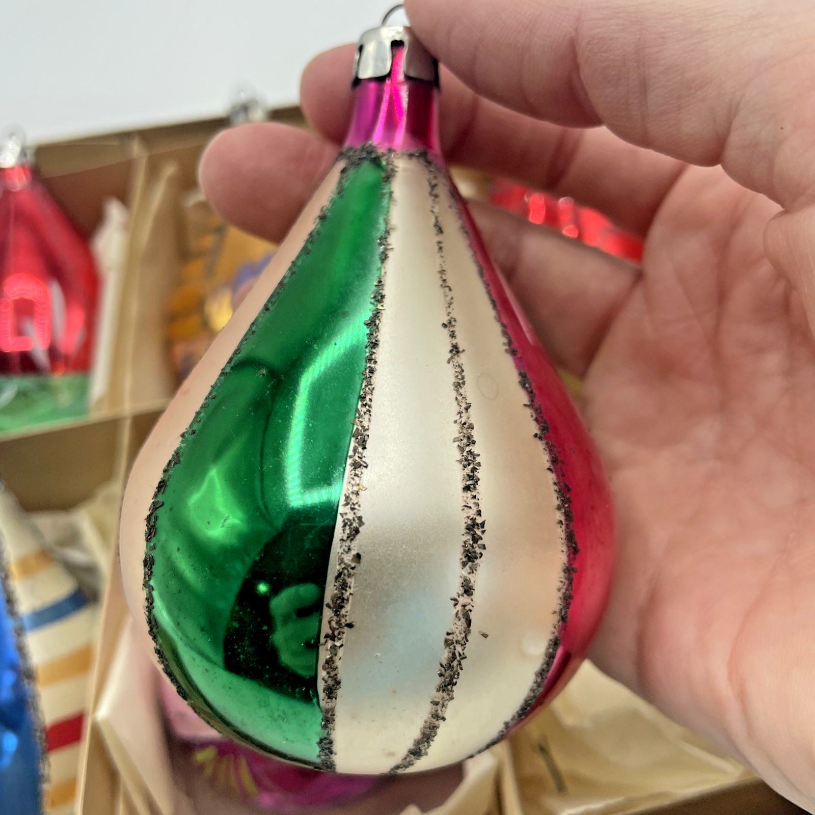 • 6 - Vintage Poland 4" Teardrop Christmas Ornaments Mercury Mica Blown Glass
