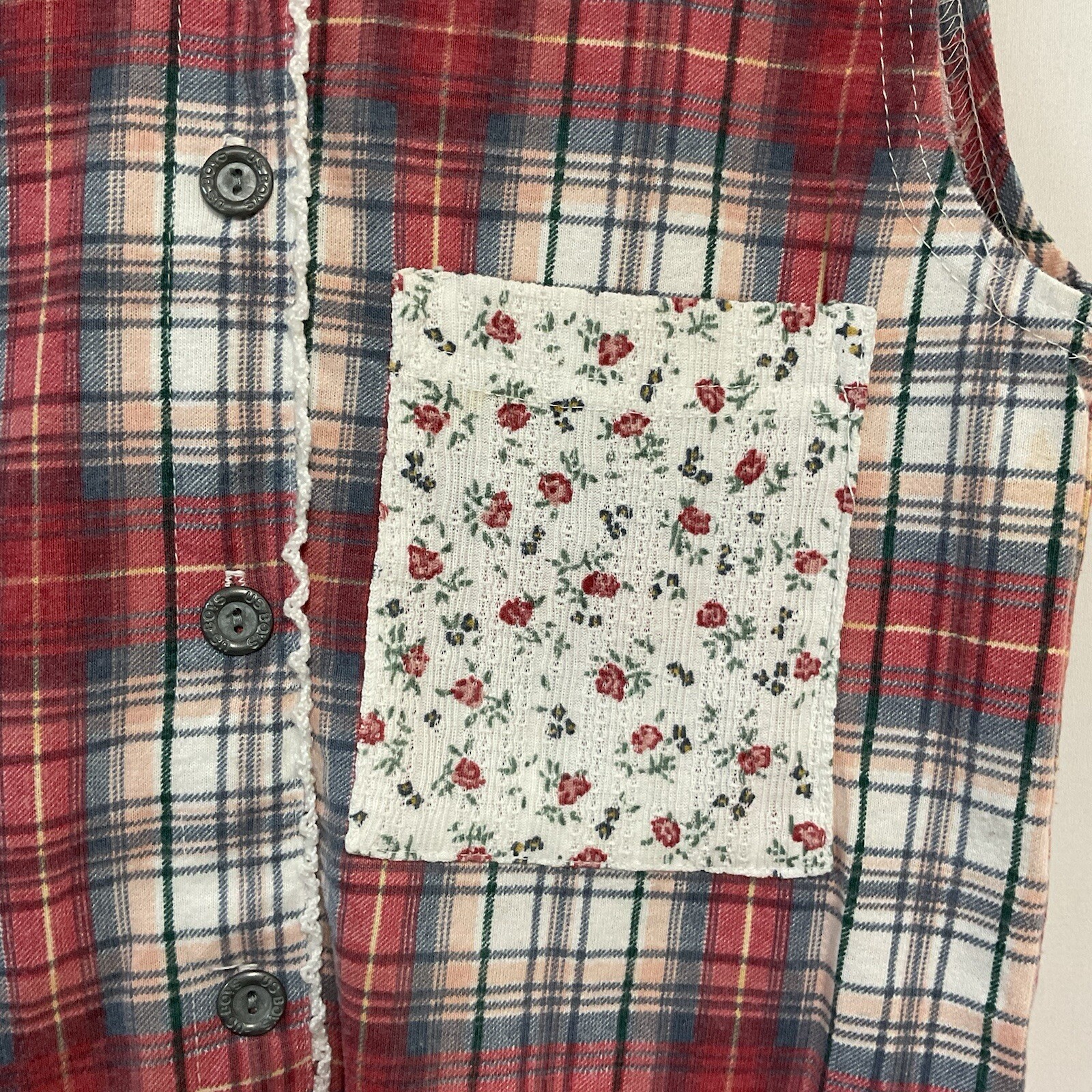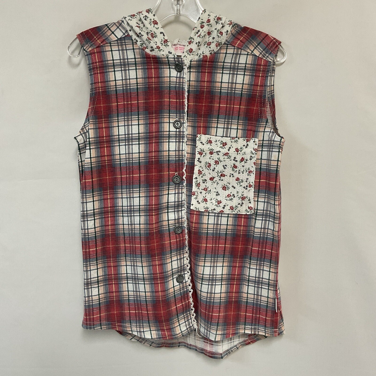 Vintage US Boys for Girls S/M Pajama Set Red Plaid Floral Hooded Top Shorts Kids