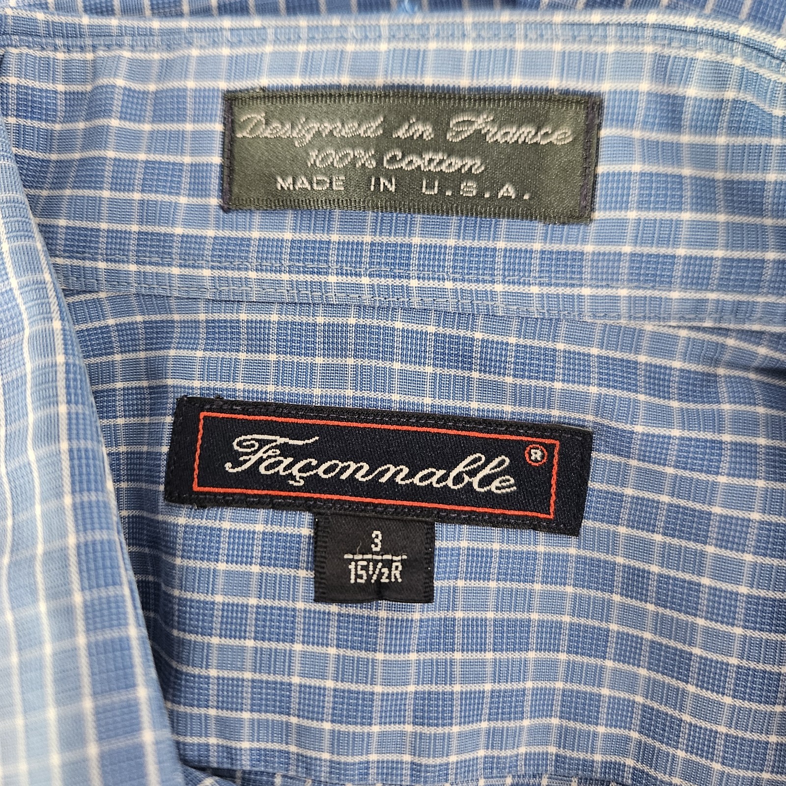 Faconnable Men's Dress Shirt Blue Check All Cotton Size 3 15.5R Made in USA