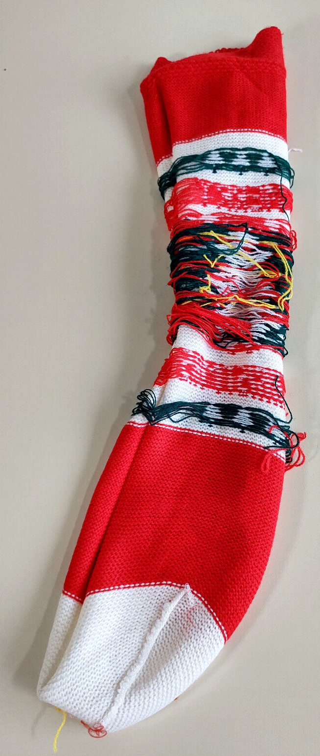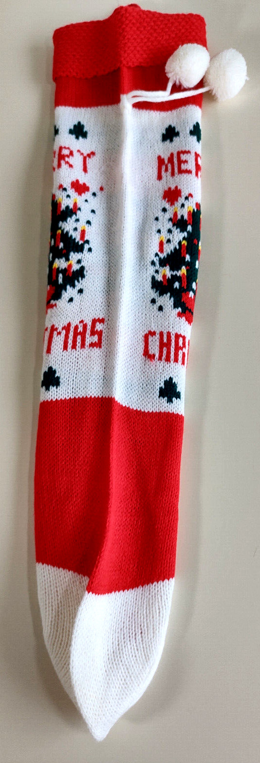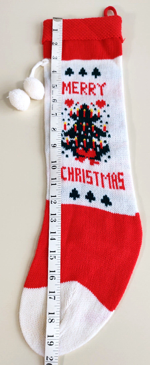 Vtg 20 Knit Christmas Stocking Red White Merry Christmas Christmas Tree Pom