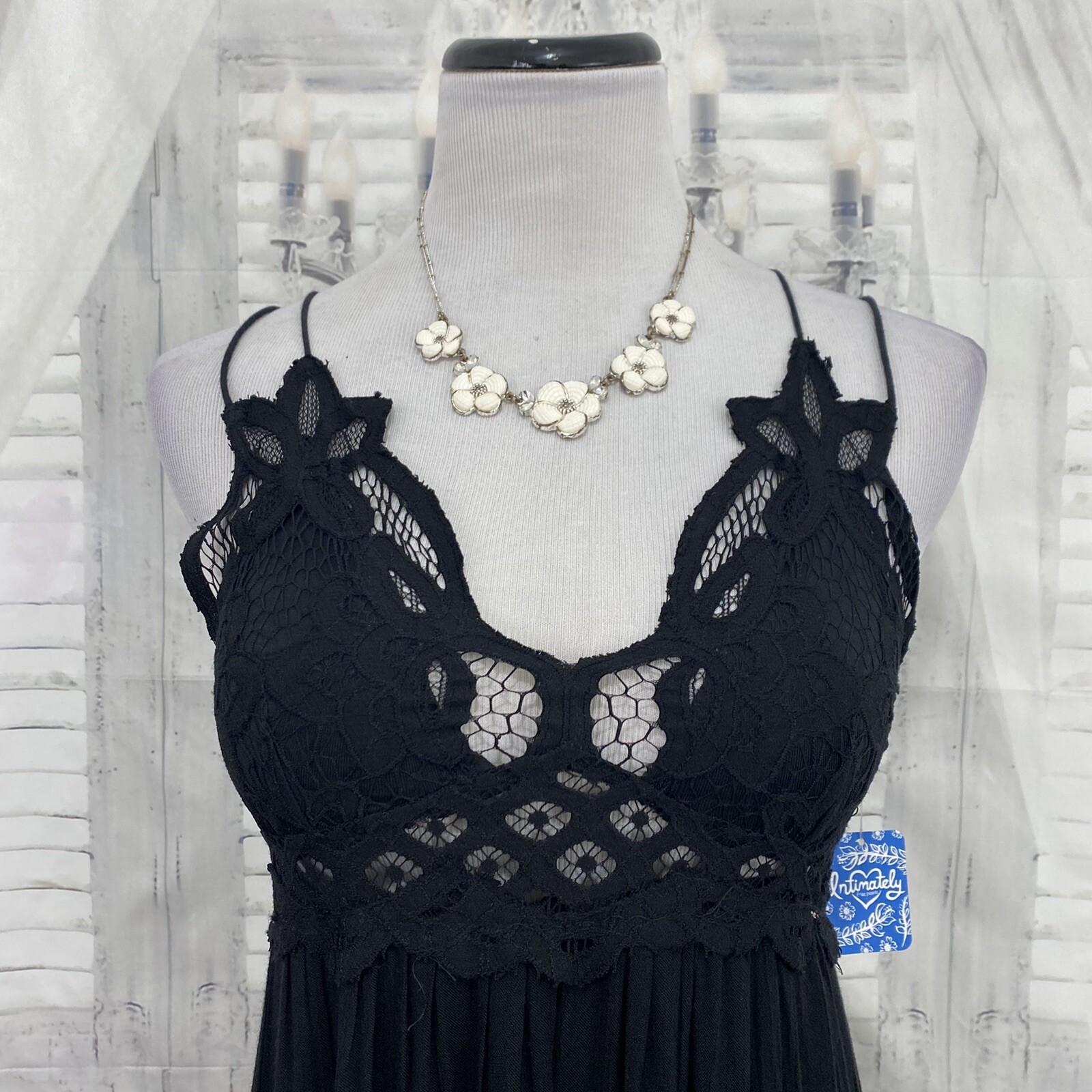как выглядит Free People XS Adella Crochet Lace Maxi Slip Dress Black Back Gauze Lined B23 фото