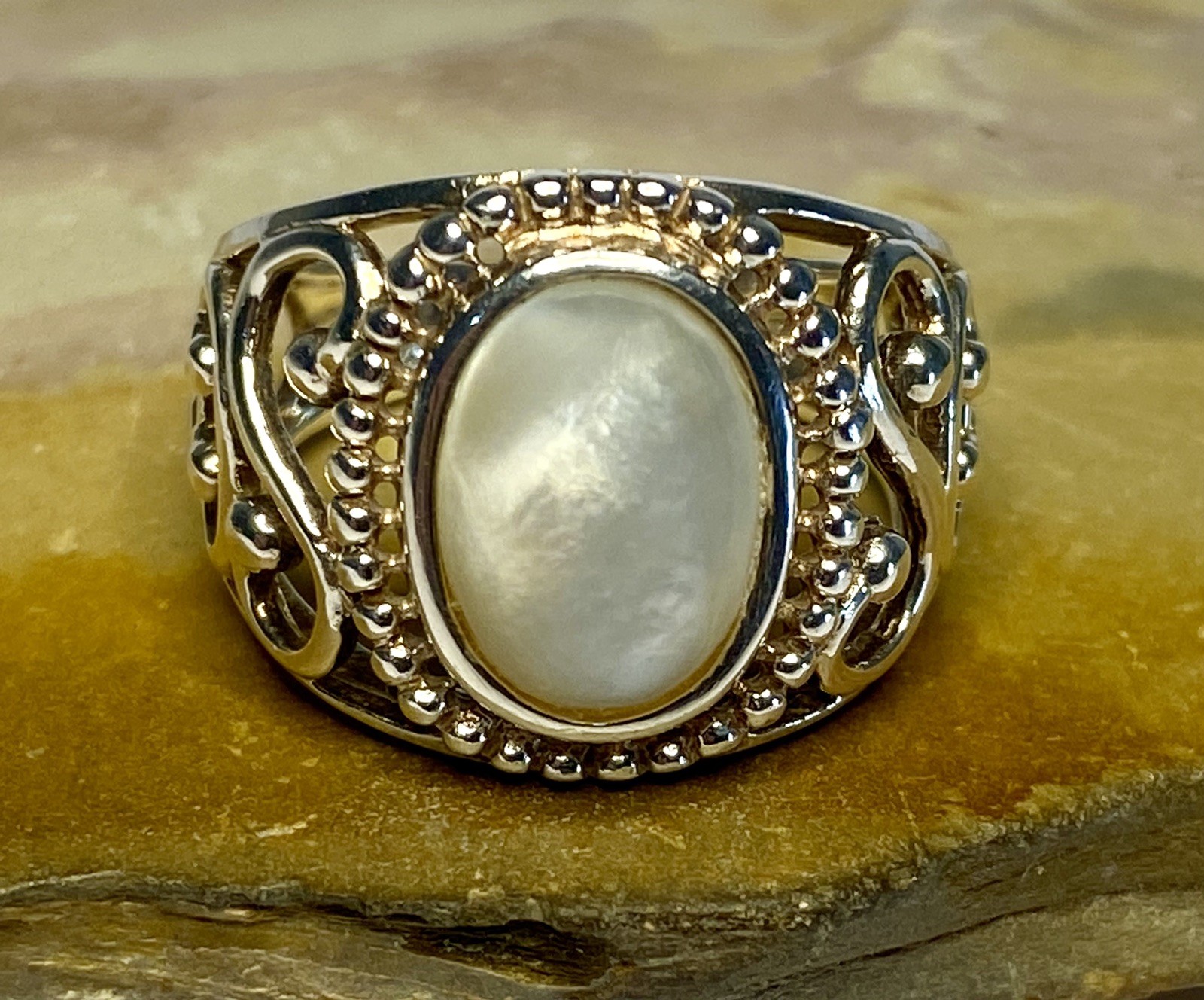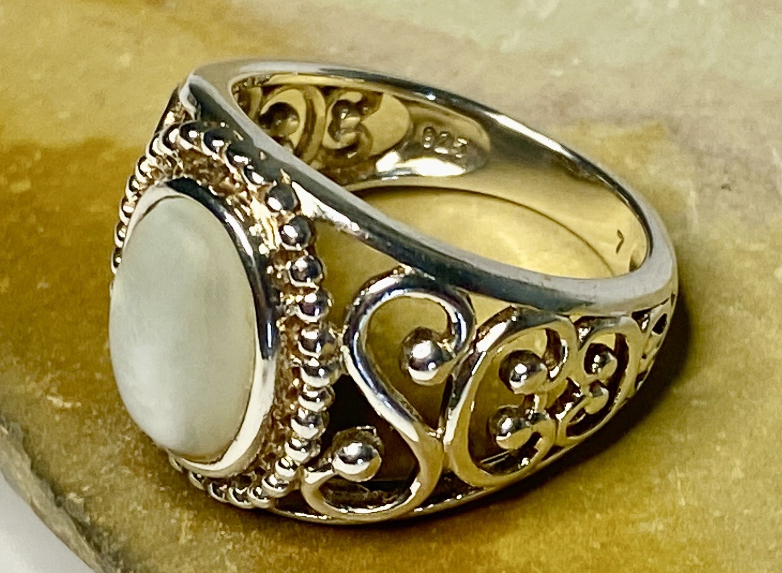 Vintage Sterling Silver Mother of Pearl Oval Stone Ornate Openwork Ring Size 7