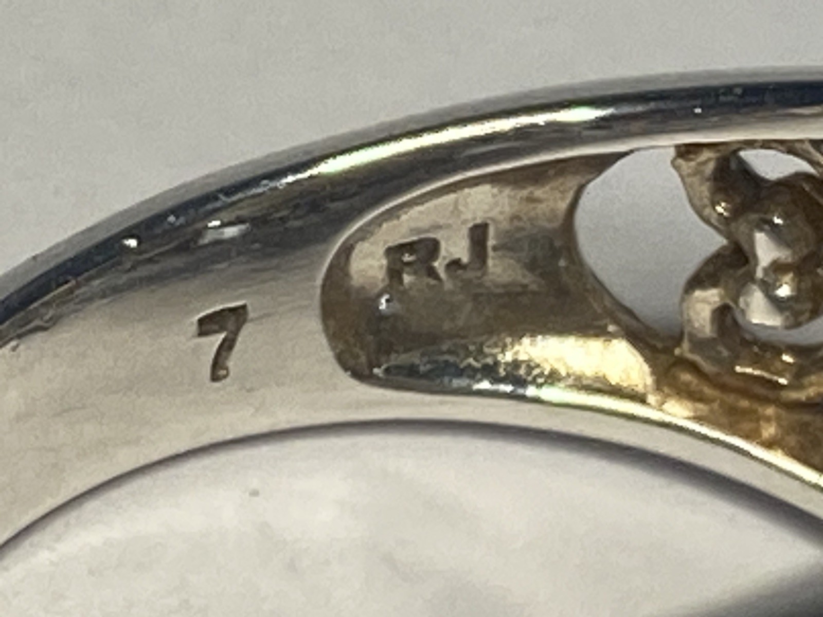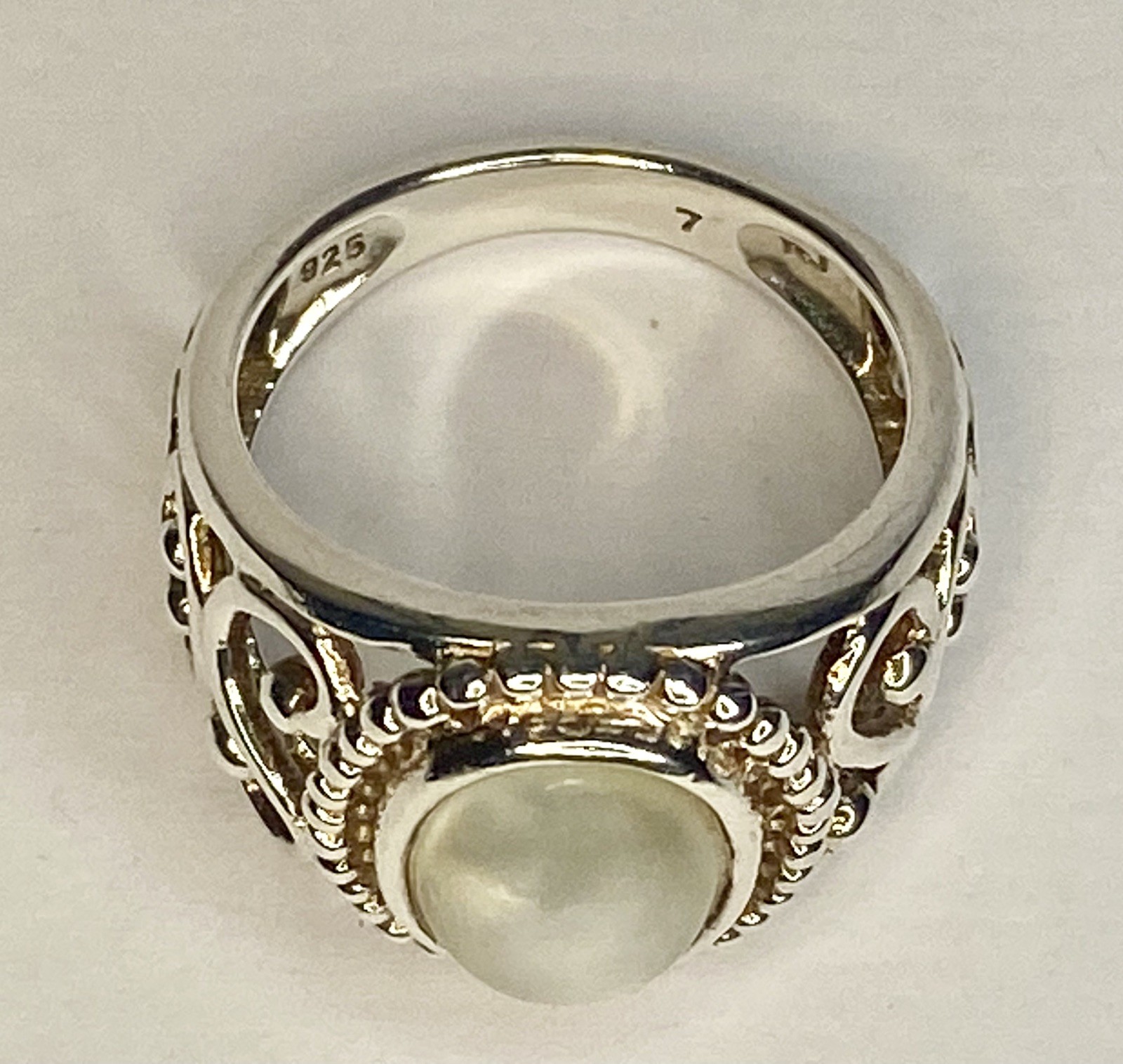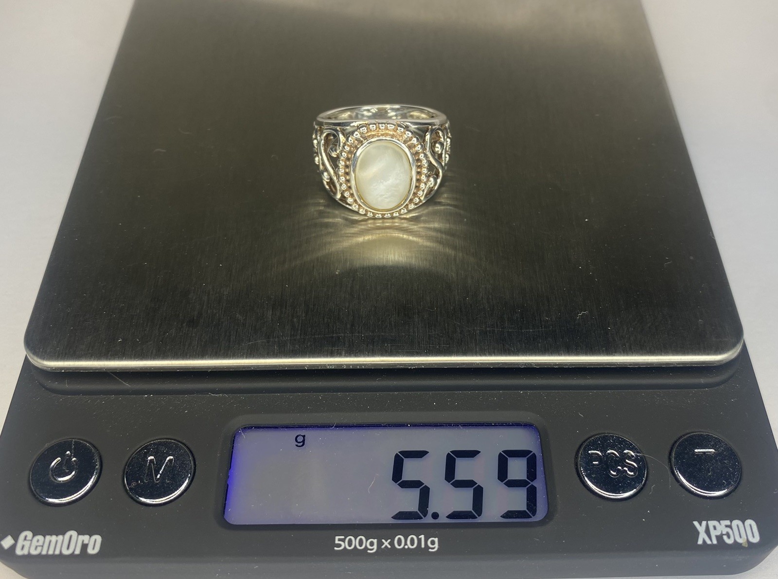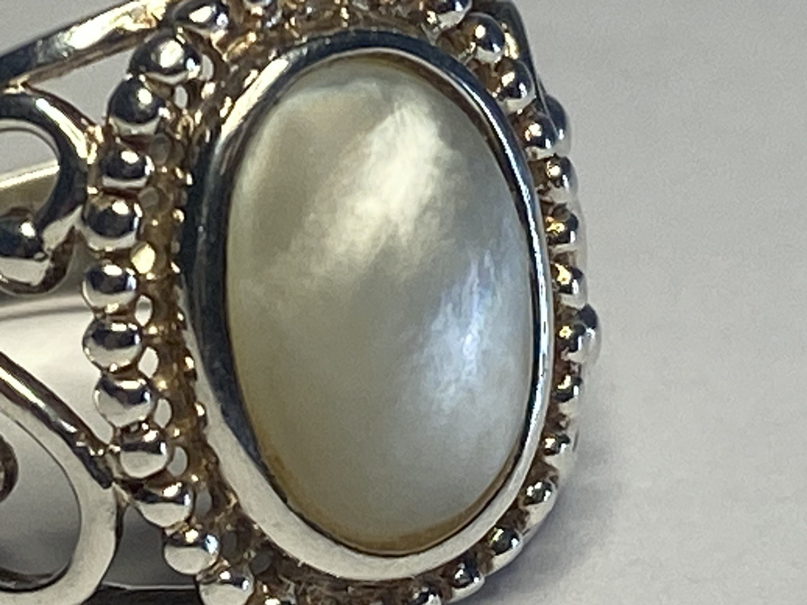 как выглядит Vintage Sterling Silver Mother of Pearl Oval Stone Ornate Openwork Ring Size 7 фото
