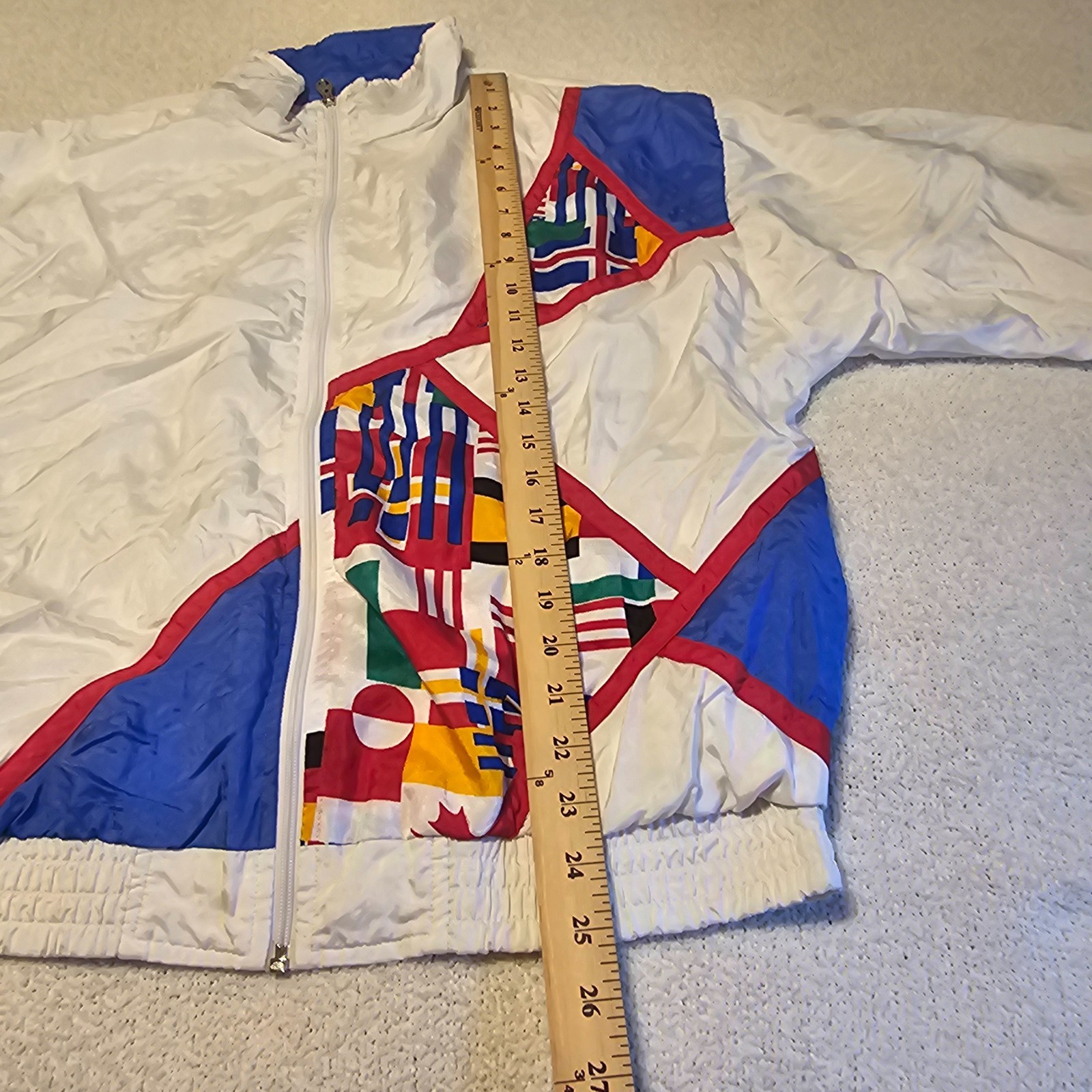 Vtg 80s Lavon Cheerful Corp White Nylon Windbreaker Jacket Colorblock Flags Sz L