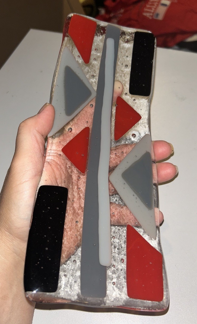 Fused Glass Mosaic Style Rectangle Bowed Plate Red Gray Black Controlled Bubbles