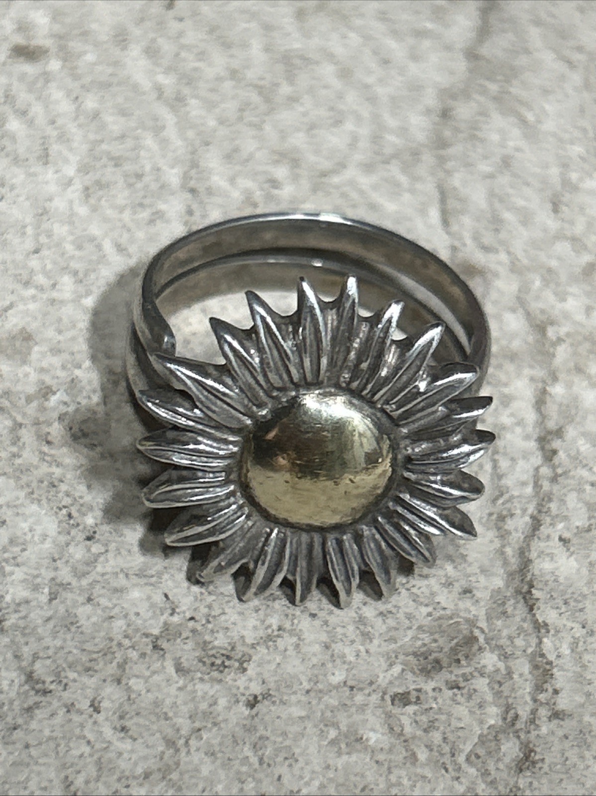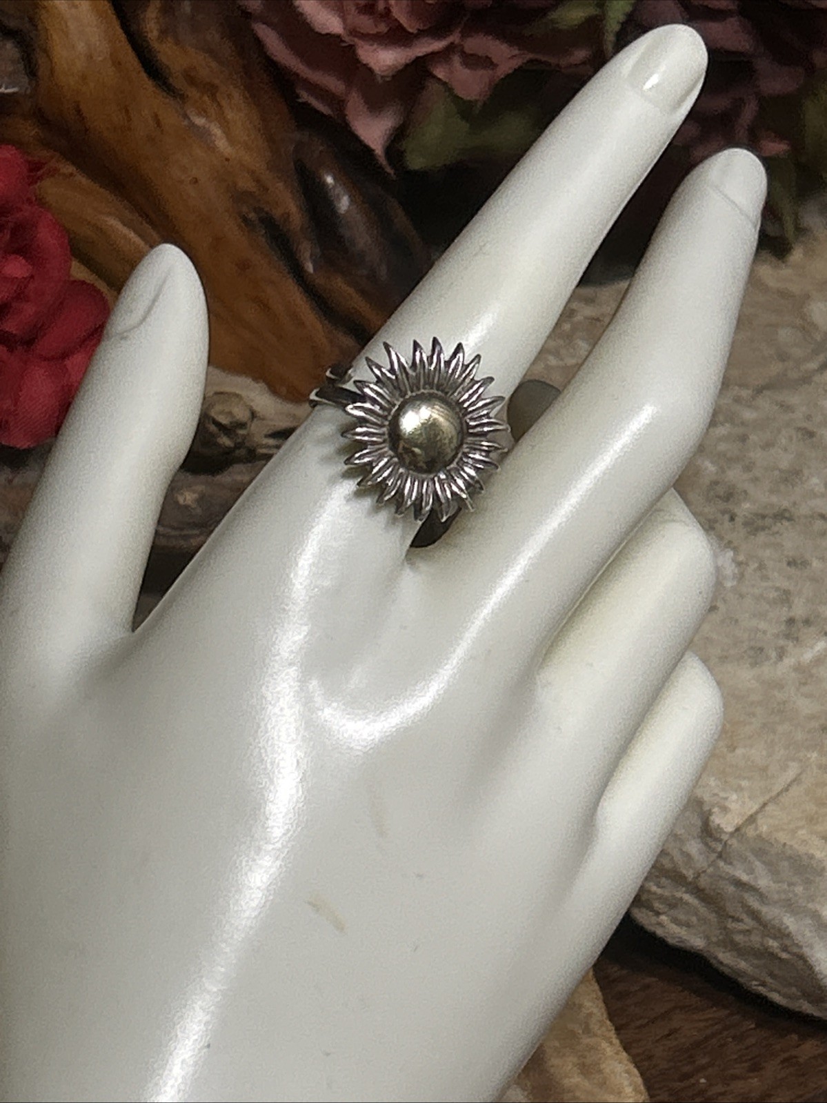 41. Vintage Marked 925 Sterling Silver Yellow middle SUN Flower Ring 7g, Adjust