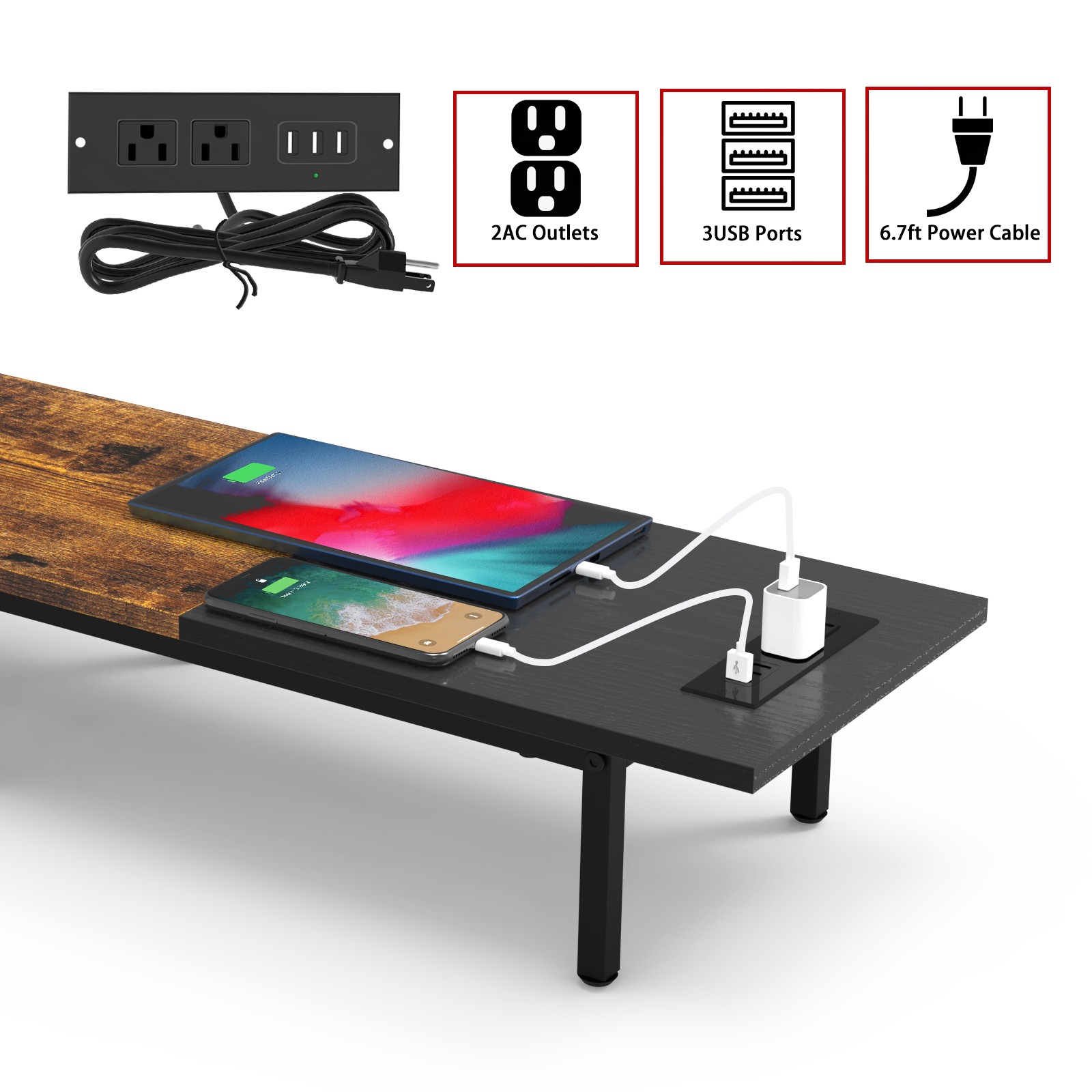 Dual Monitor Stand Riser with 2 USB Charging Ports, Wood Computer Desk Organizer