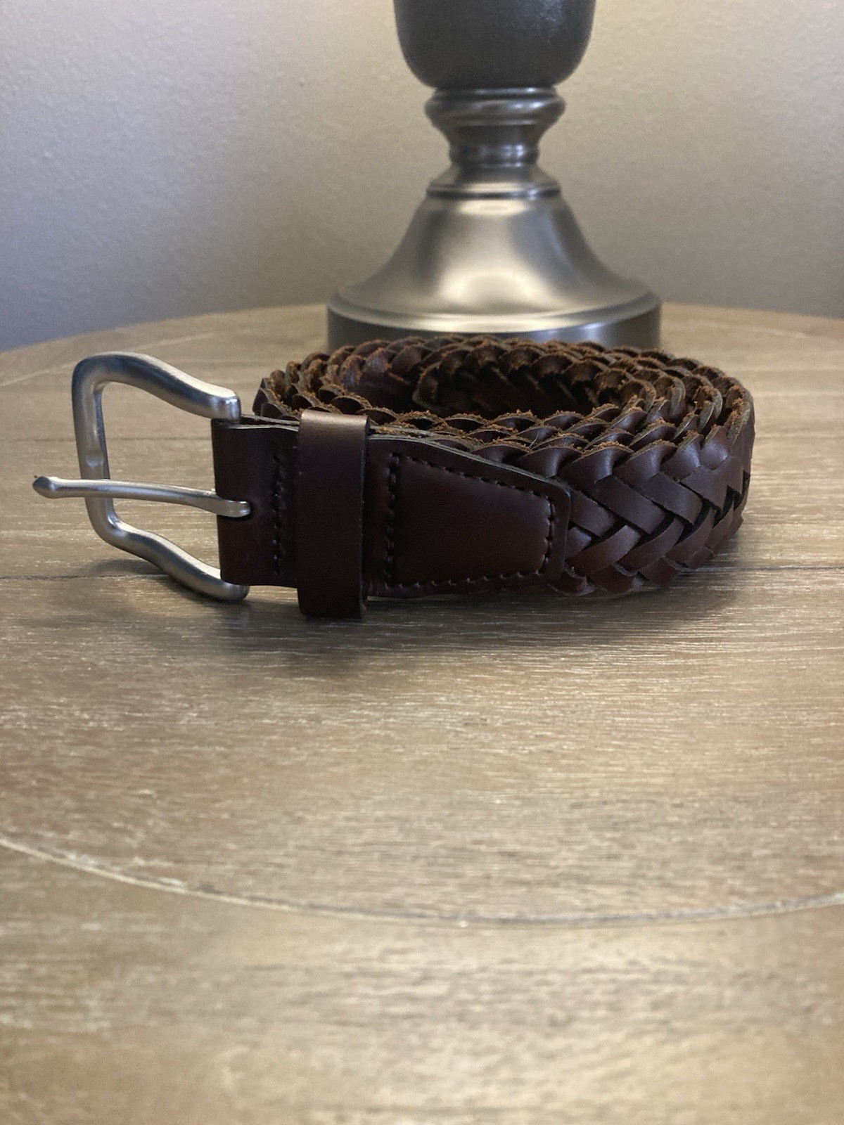 как выглядит Men s Brown Leather Woven Belt Braided Size 43 Lg. Vintage Made In Guatemala фото