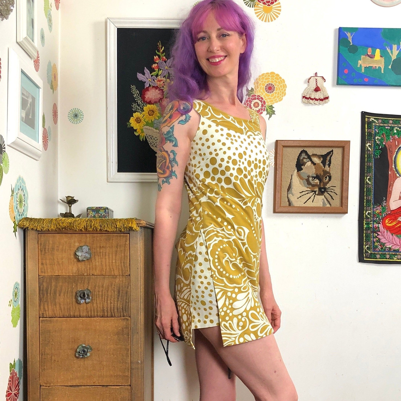 как выглядит Vintage Romper, 60s Loungees Romper with Hidden Shorts, Golden Yellow Cream, S фото