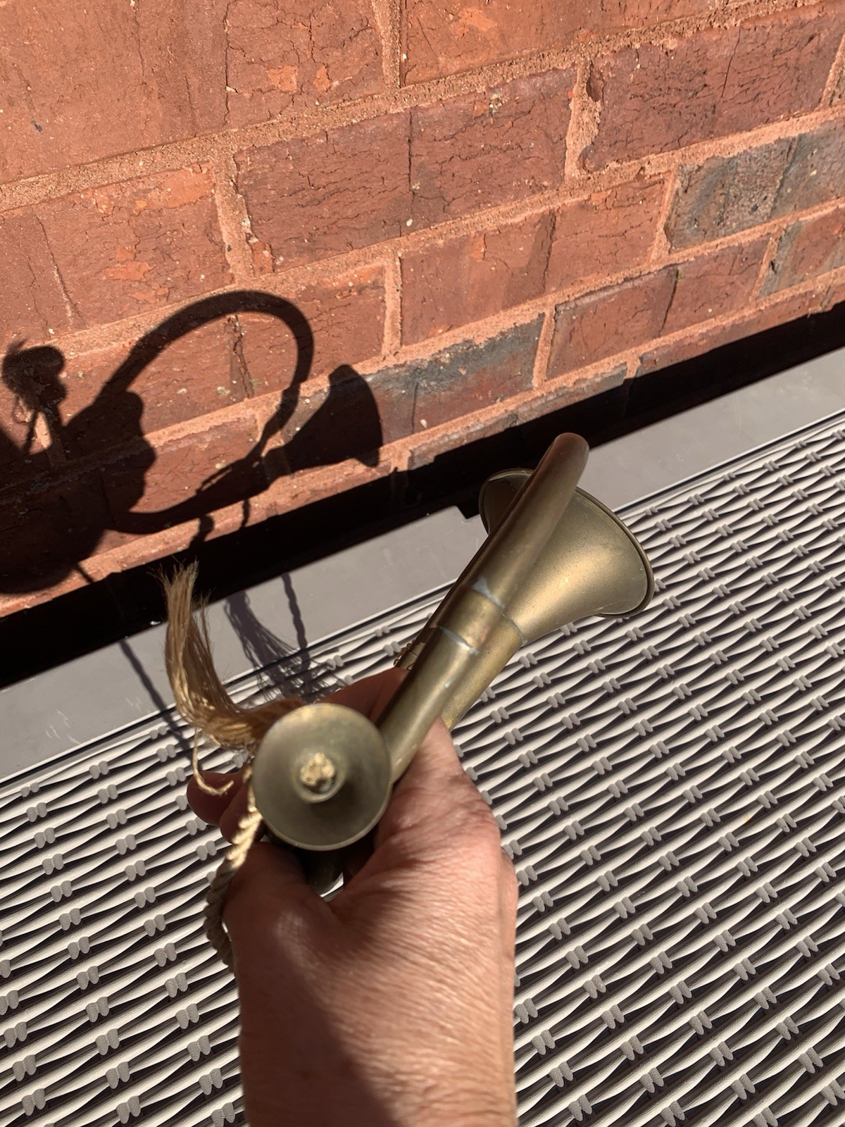 как выглядит French Horn brass Christmas Trumpet Bugle Hanging gold tassel 12" Vintage India фото