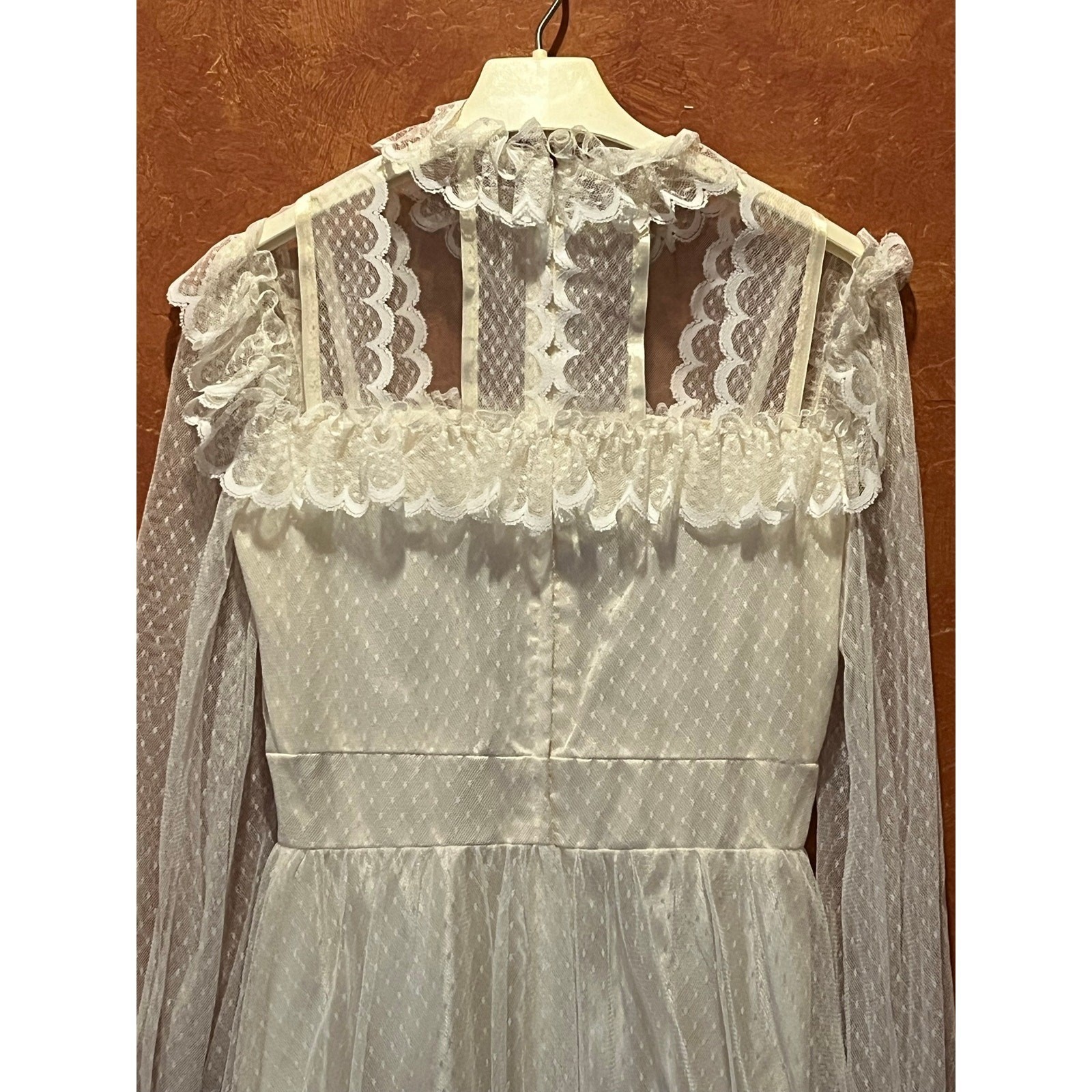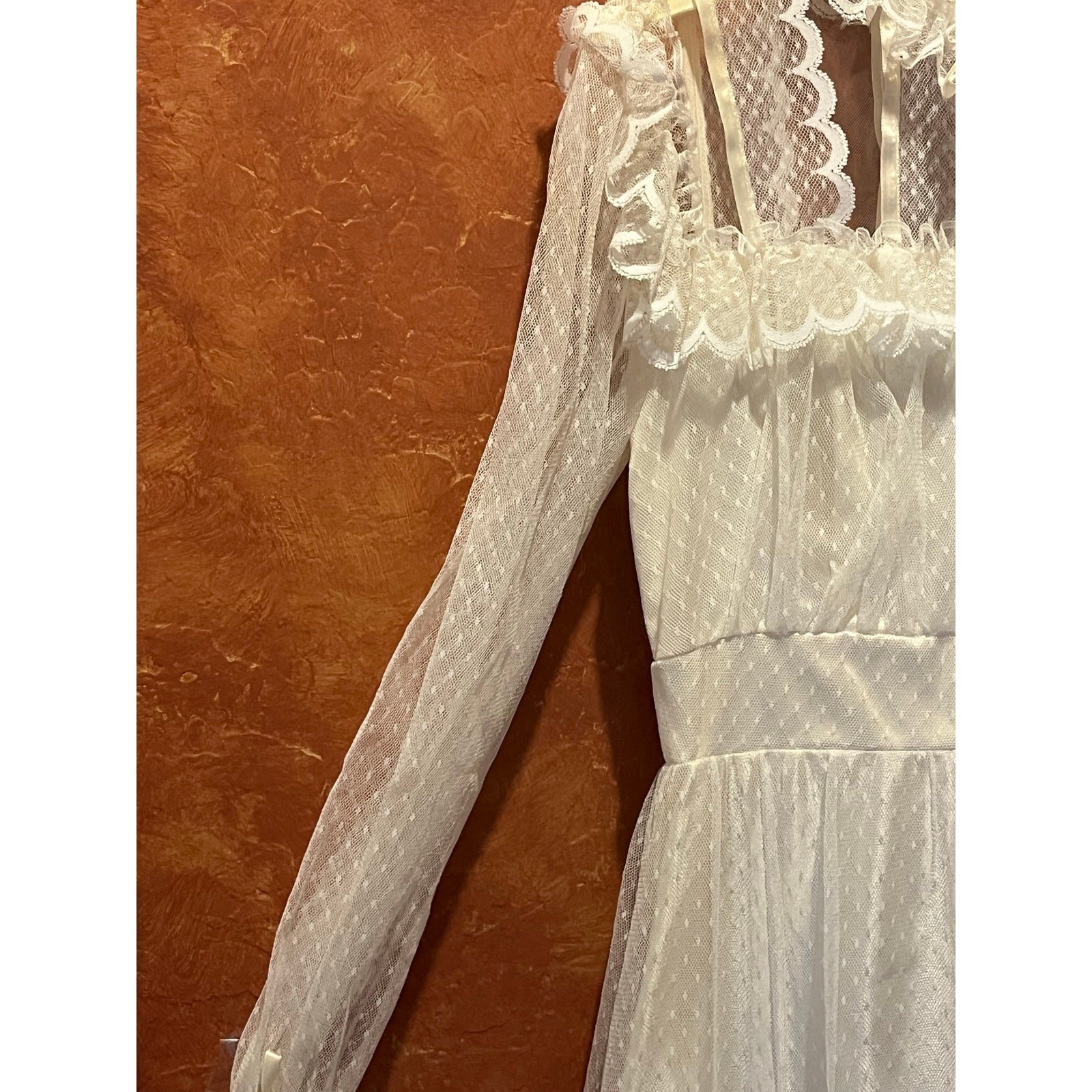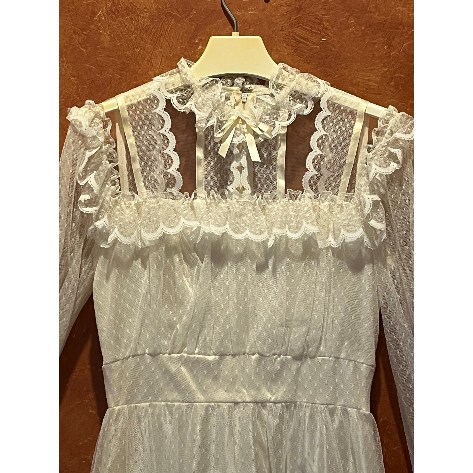 как выглядит VTG Full Lace Satin Wedding Gown Dress Modest 70s Prairie Alessandro Bridal фото