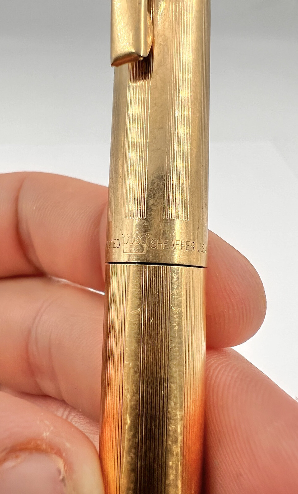 • Vintage Sheaffer Targa Gold Electroplated White Dot Stripe Pattern Ballpoint Pen