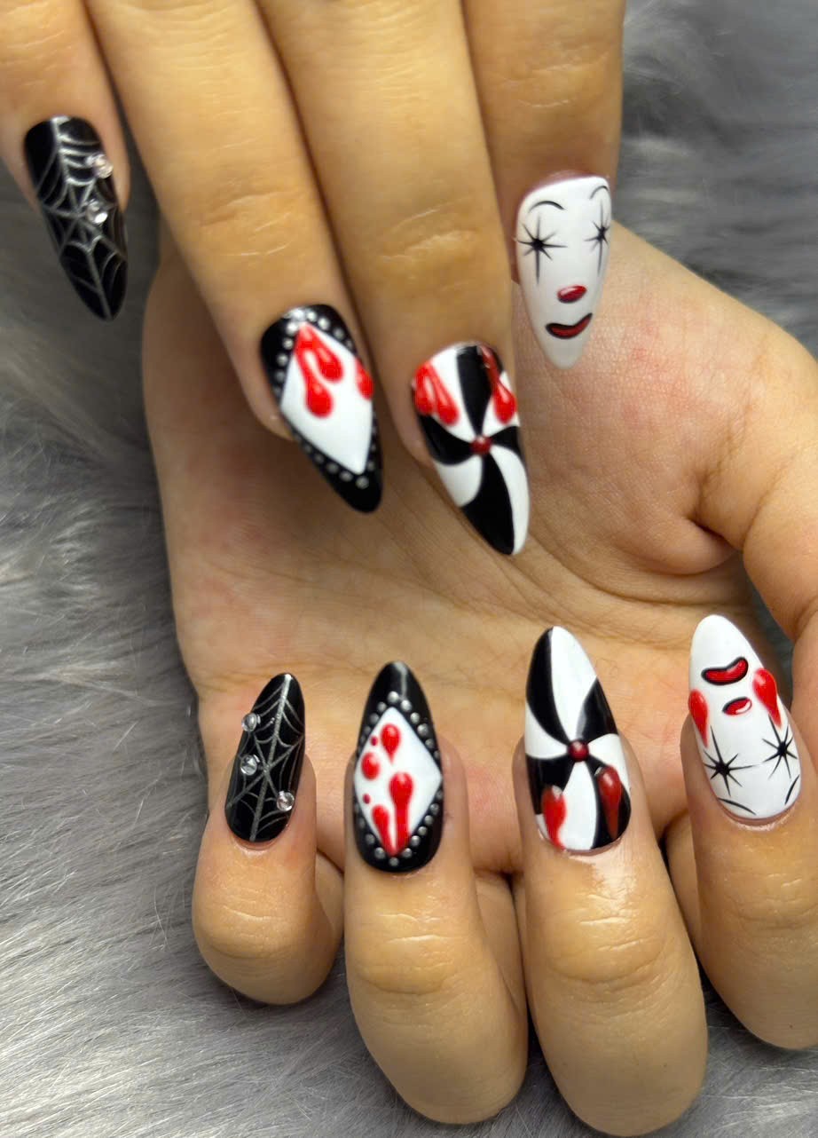 Hand made Monochrome Jester Press On Nails: Chrome Spider Web Gothic Nail Art