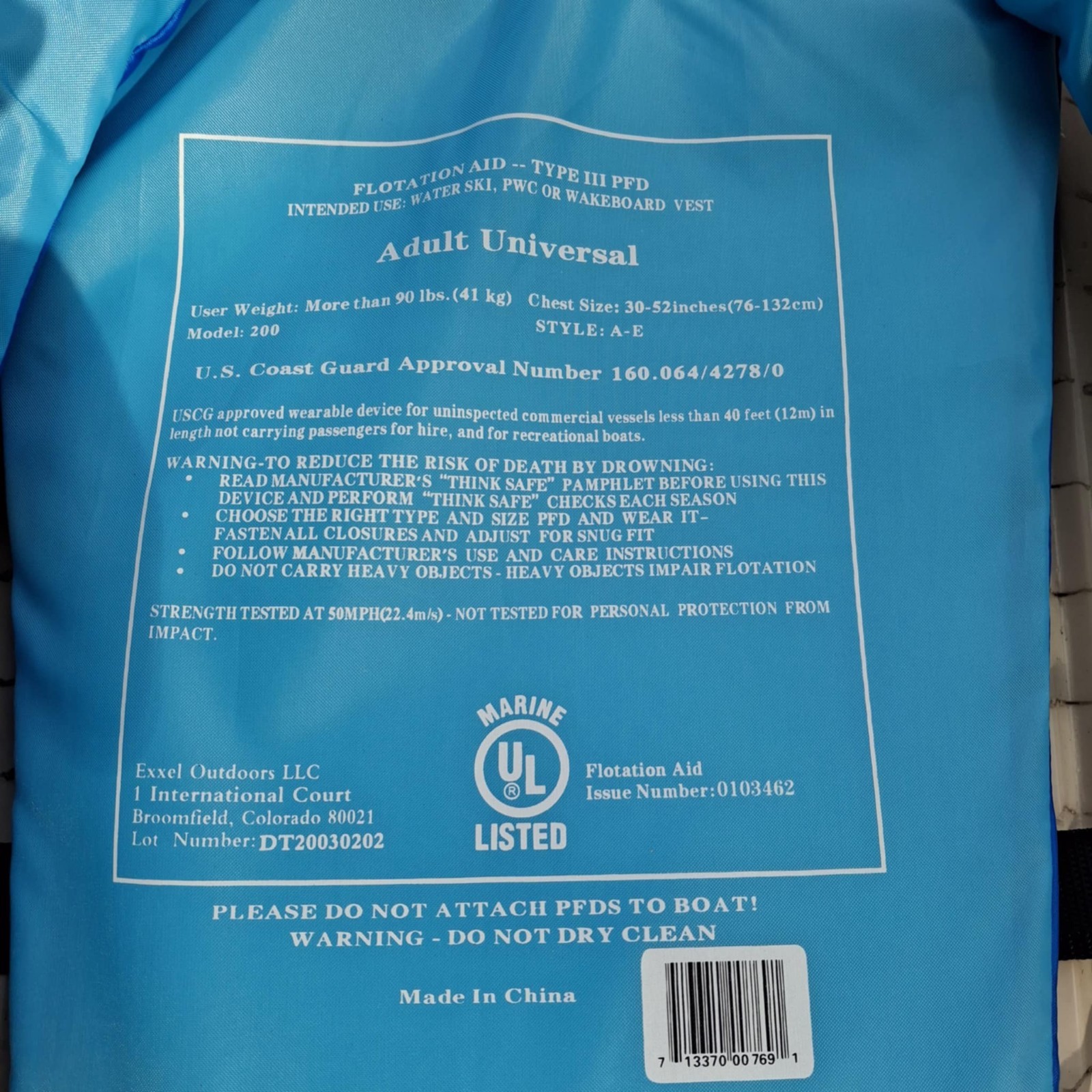 X2O Universal Adult Life Jacket 30 - 52 Chest - Over 90Lbs. - New