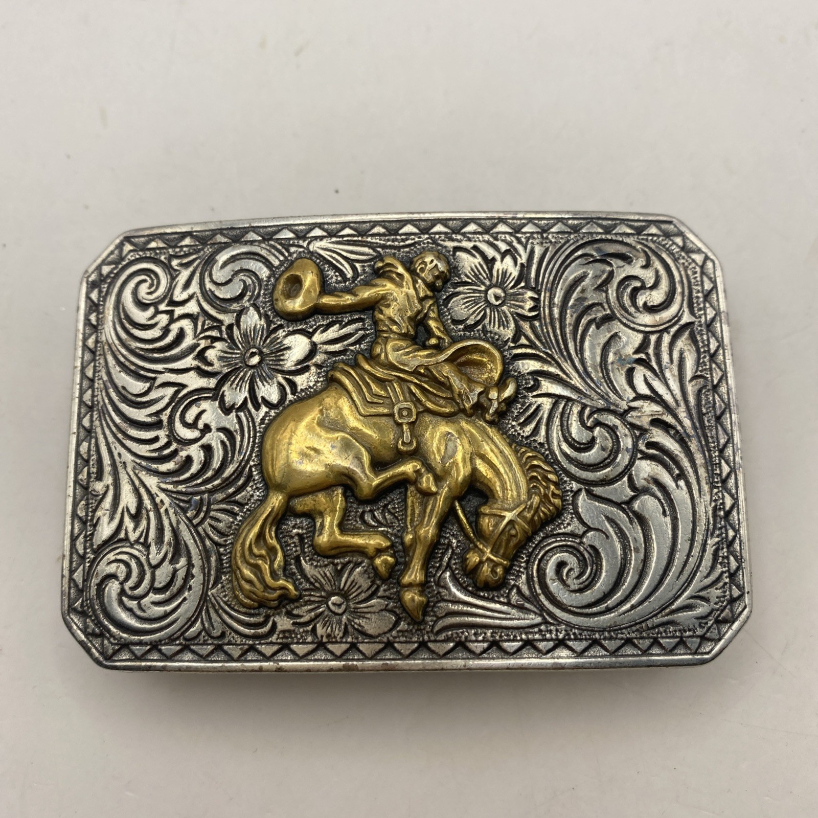 Rodeo Cowboys Bucking Horse Belt Buckle Ornate Floral Scroll Vtg Nocona SILVER
