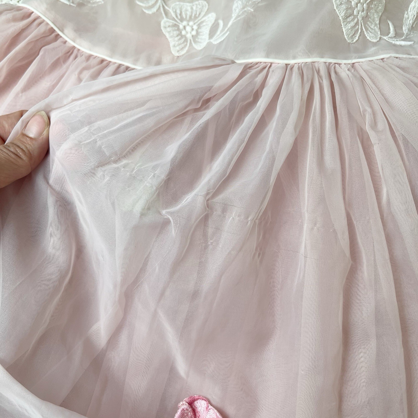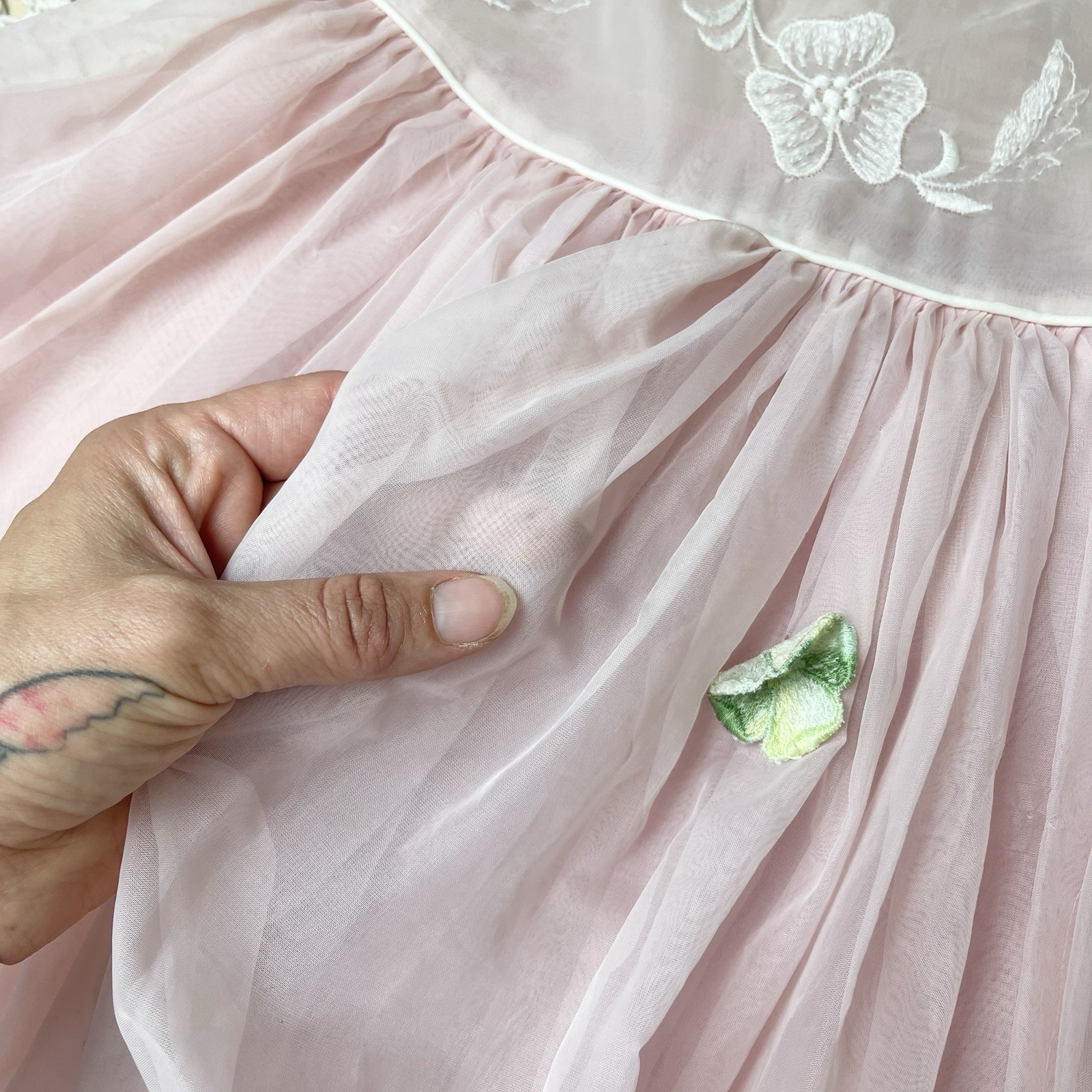 как выглядит Vintage 1950s Girls 8 Years Pink Sheer Floral Applique Dainty Party Dress фото
