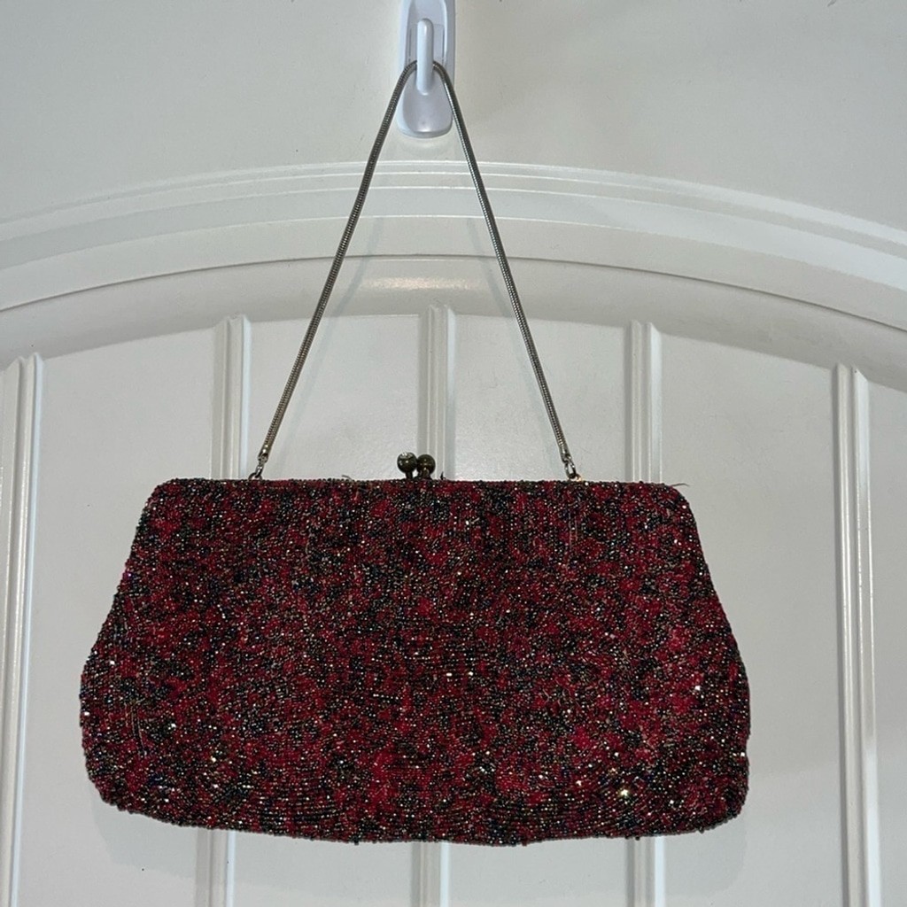 как выглядит gorgeous MCM red iridescent hand beaded vintage WALBORG evening bag Belgium made фото