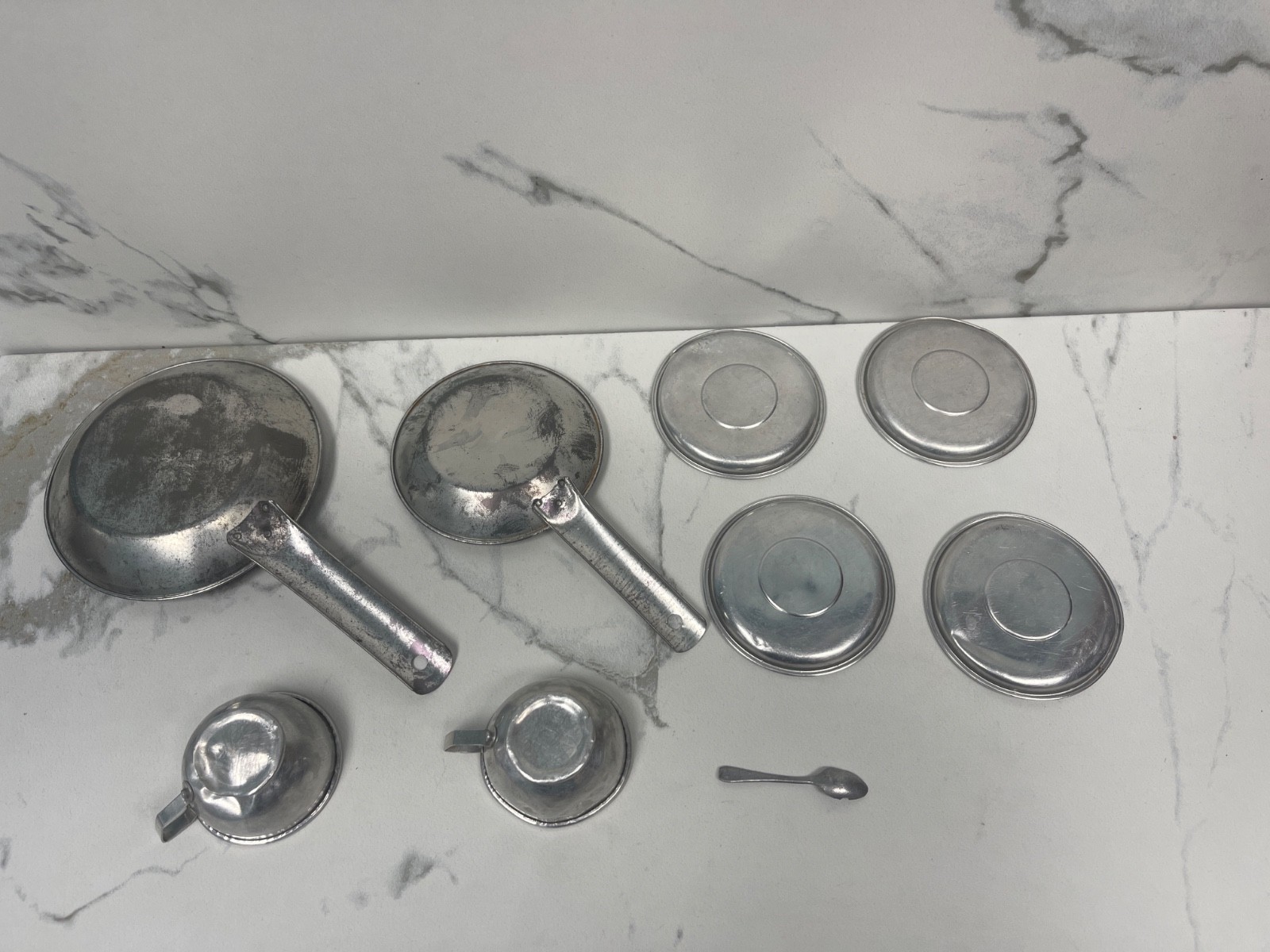 Vintage Metal Toy Kitchen Lot Mid Century Play Dishes Pans Cups 9 Pc
