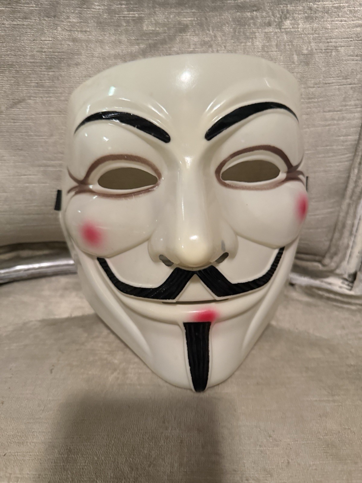 • This is a modern Guy Fawkes mask, a replica of the V for Vendetta mask.