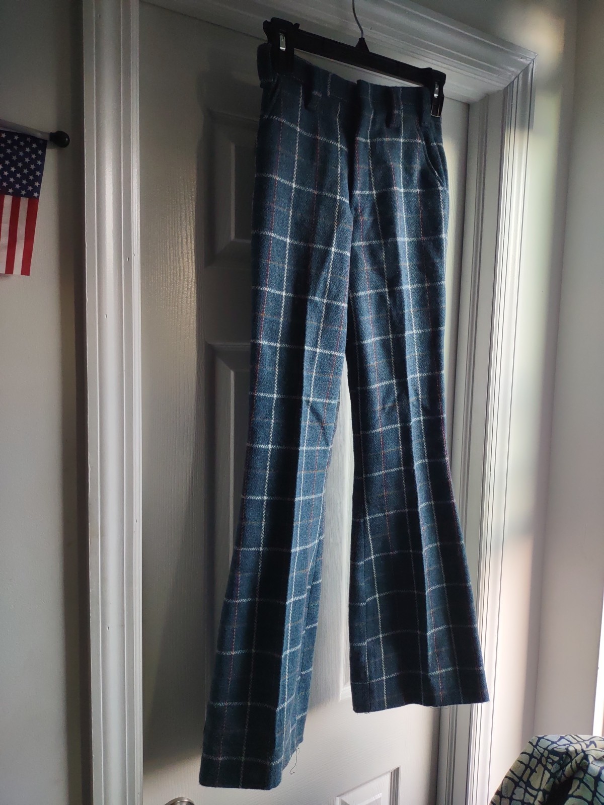 как выглядит 70s Vintage Unisex Skinny Plaid Wide Bell Bottom Pants JBC Of Madera 24" Waist фото