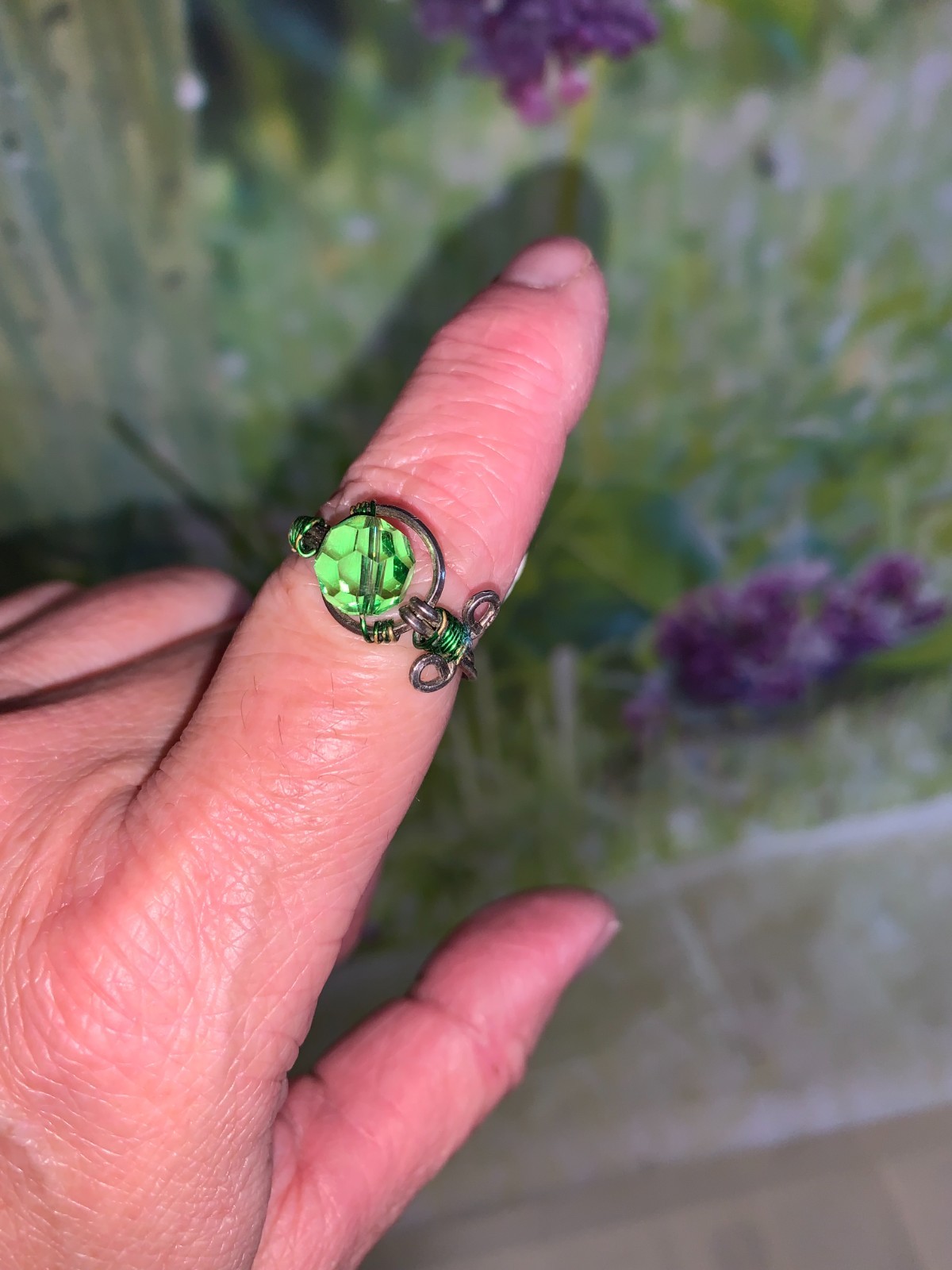 wire wrap ring Silver Patina wrap with Green Crystal bead size 7 NEW
