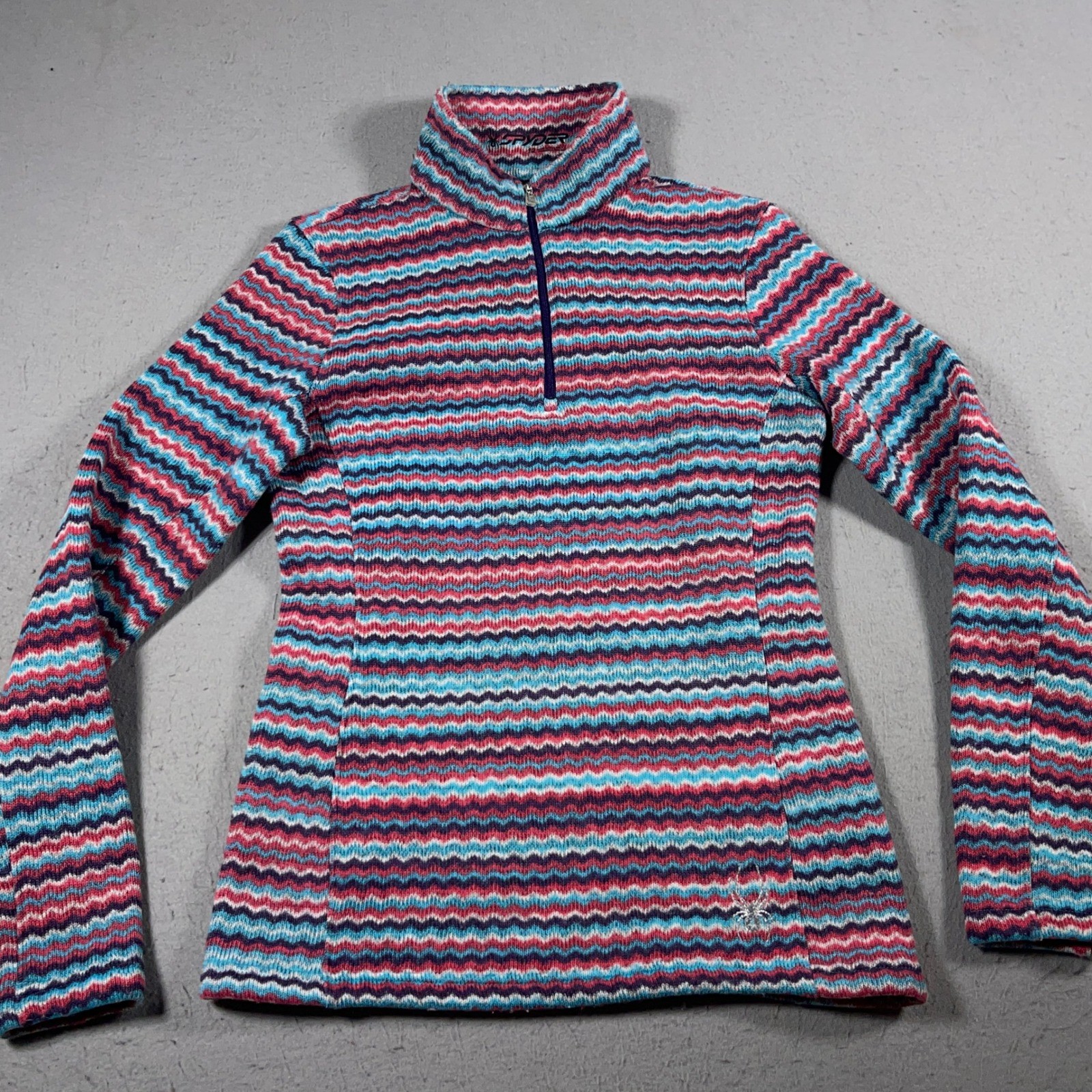 Spyder Fleece Pullover Women 10 Zigzag Stripe 1/4 Zip Blue Pink Warm Outdoor Ski