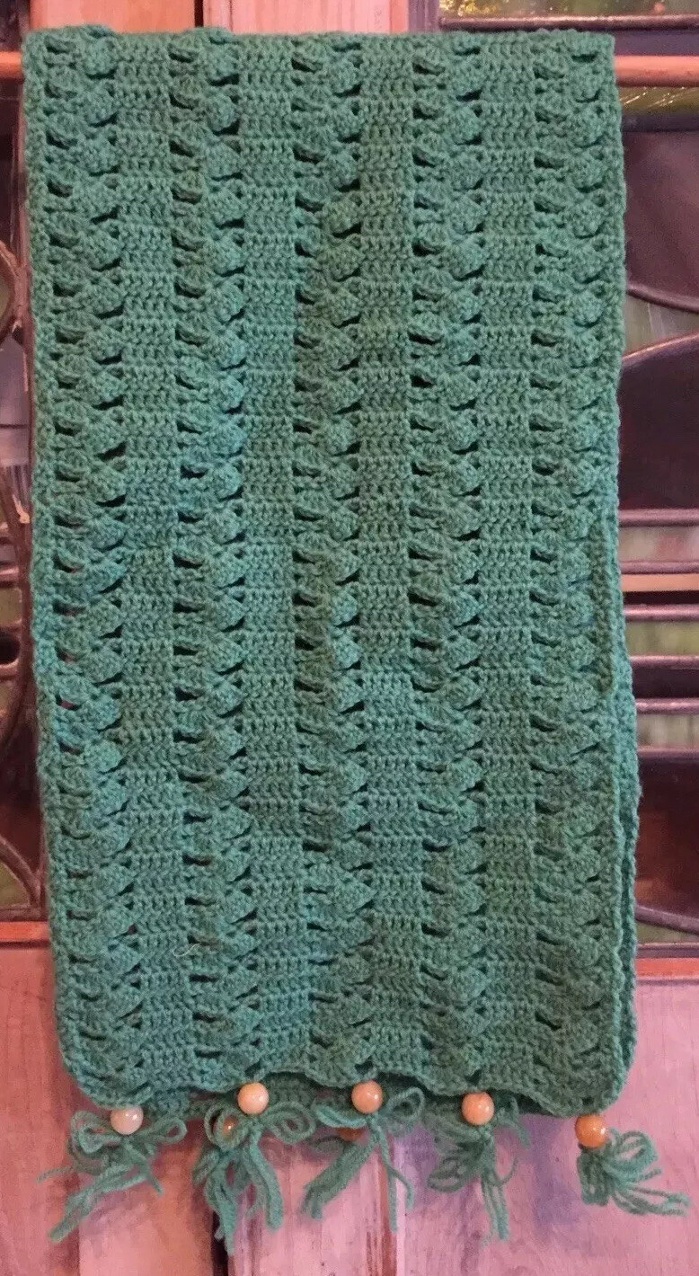Vintage Handmade Green Knitted Crochet Scarf Genuine Stone Tassels Bows EUC