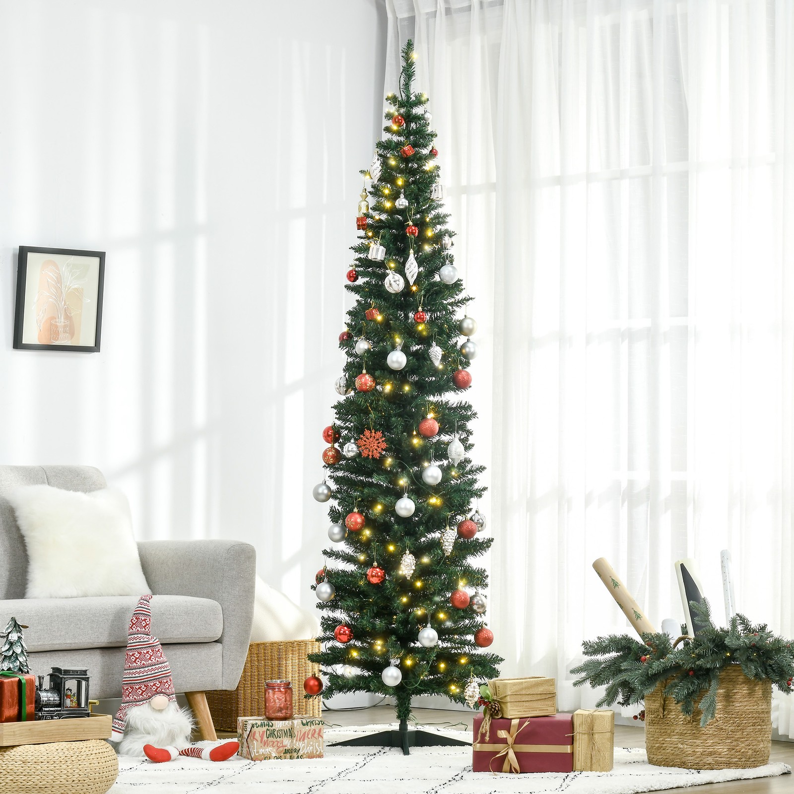 7ft Prelit Slim Noble Fir Pencil Christmas Tree, 200 Warm White LEDs, 499 Tips