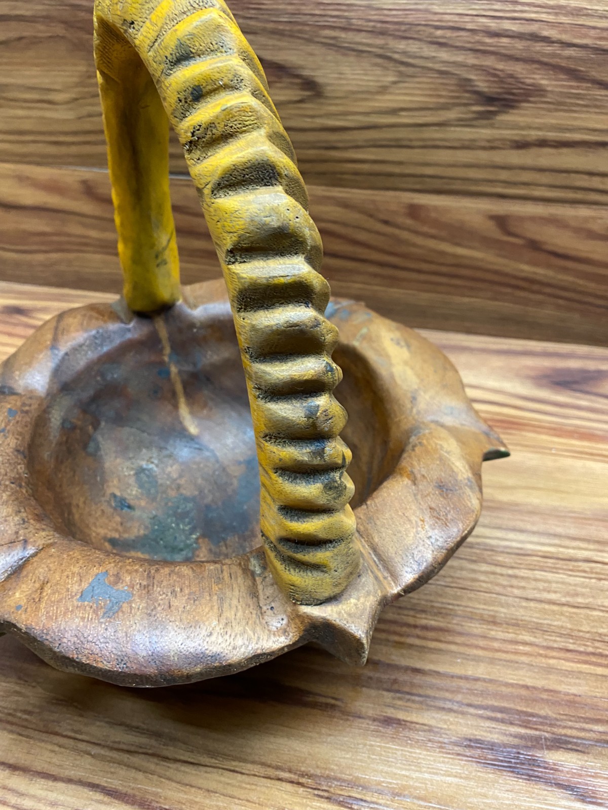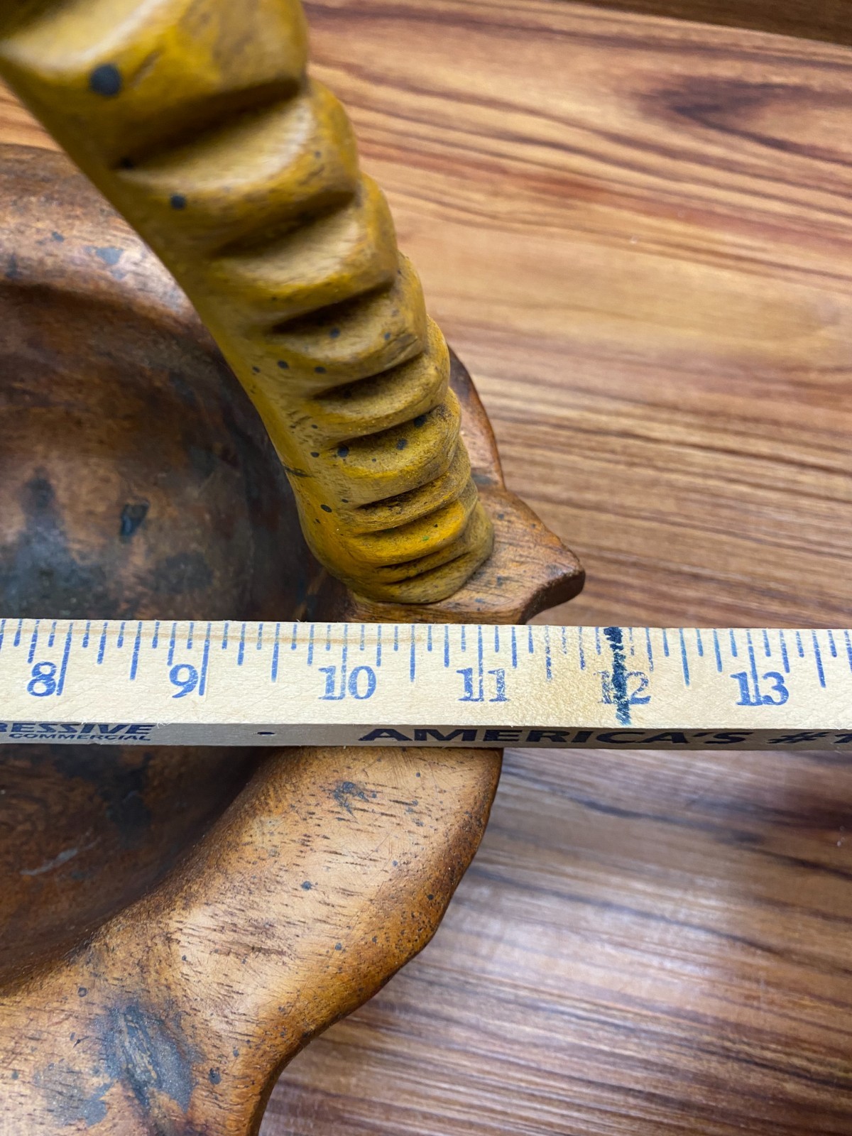 как выглядит Vtg Hand Carved Burl Wood Bowl Basket Knobby Handled 12 x 12 Red Green фото