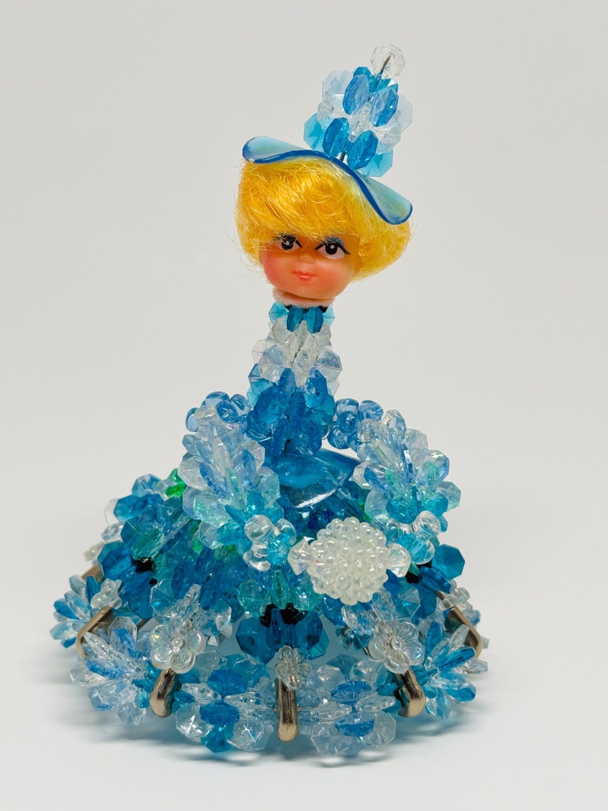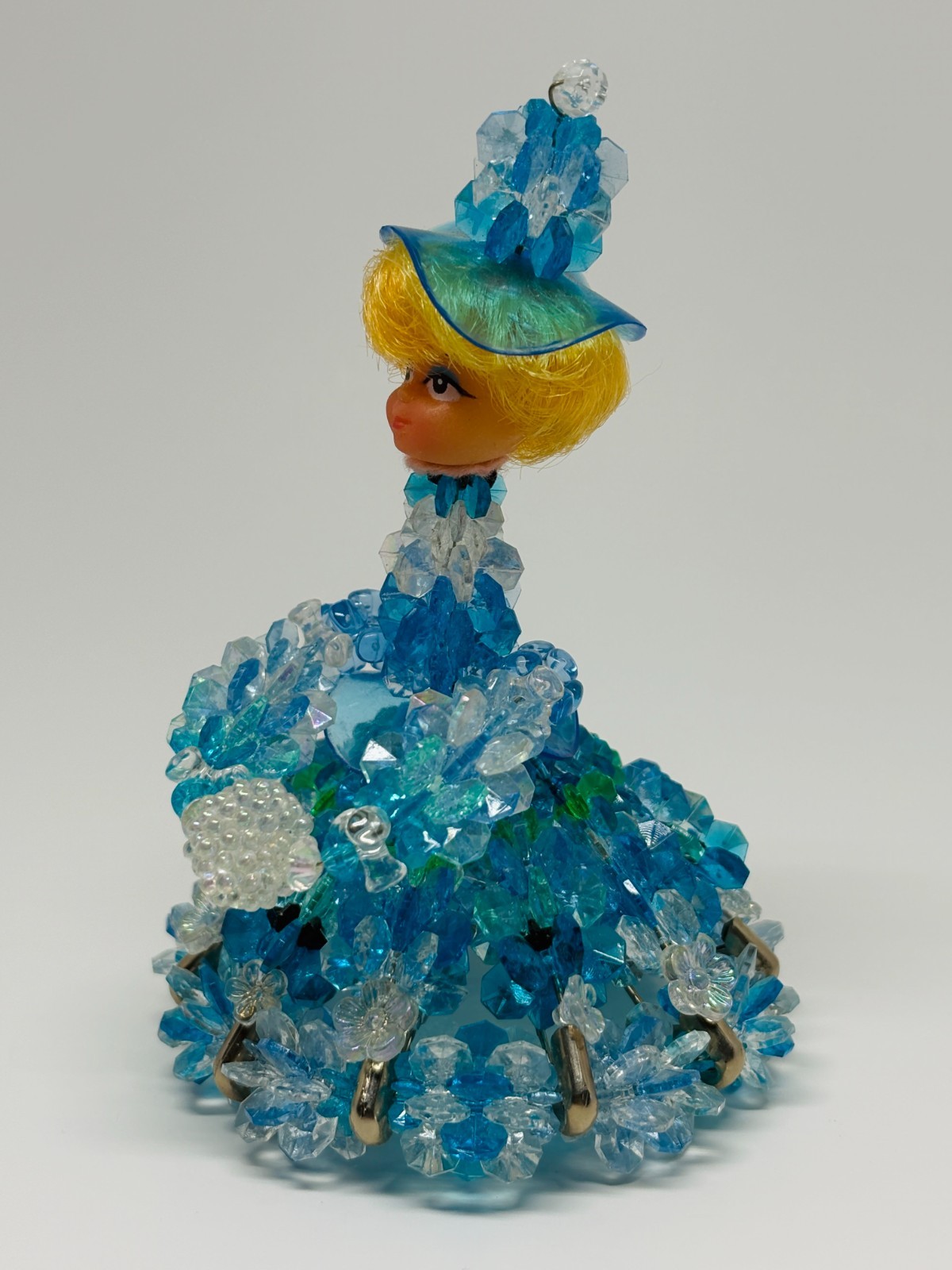 Vintage Safety Pin Blue Beaded Doll Craft Blond Kitschy