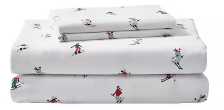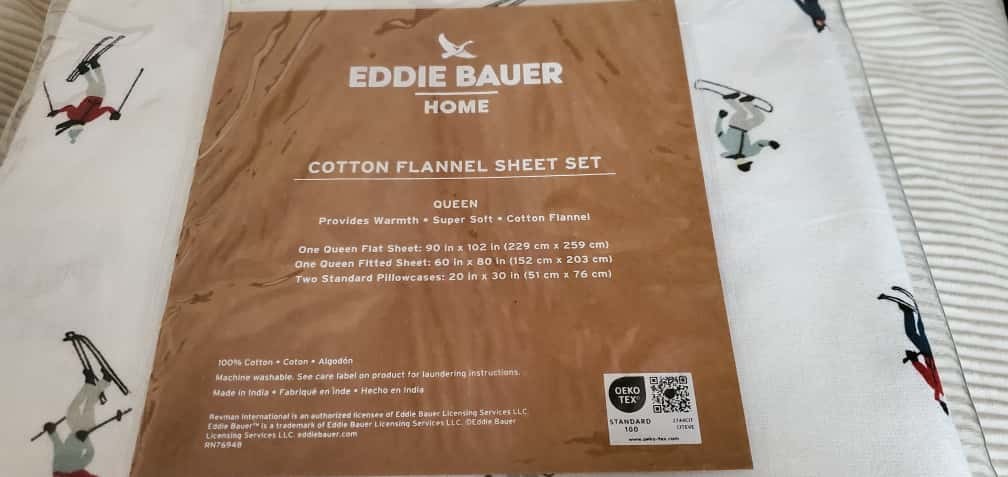 Eddie Bauer QUEEN Flannel Sheet Set Brushed Cotton White Skiers Soft winter warm