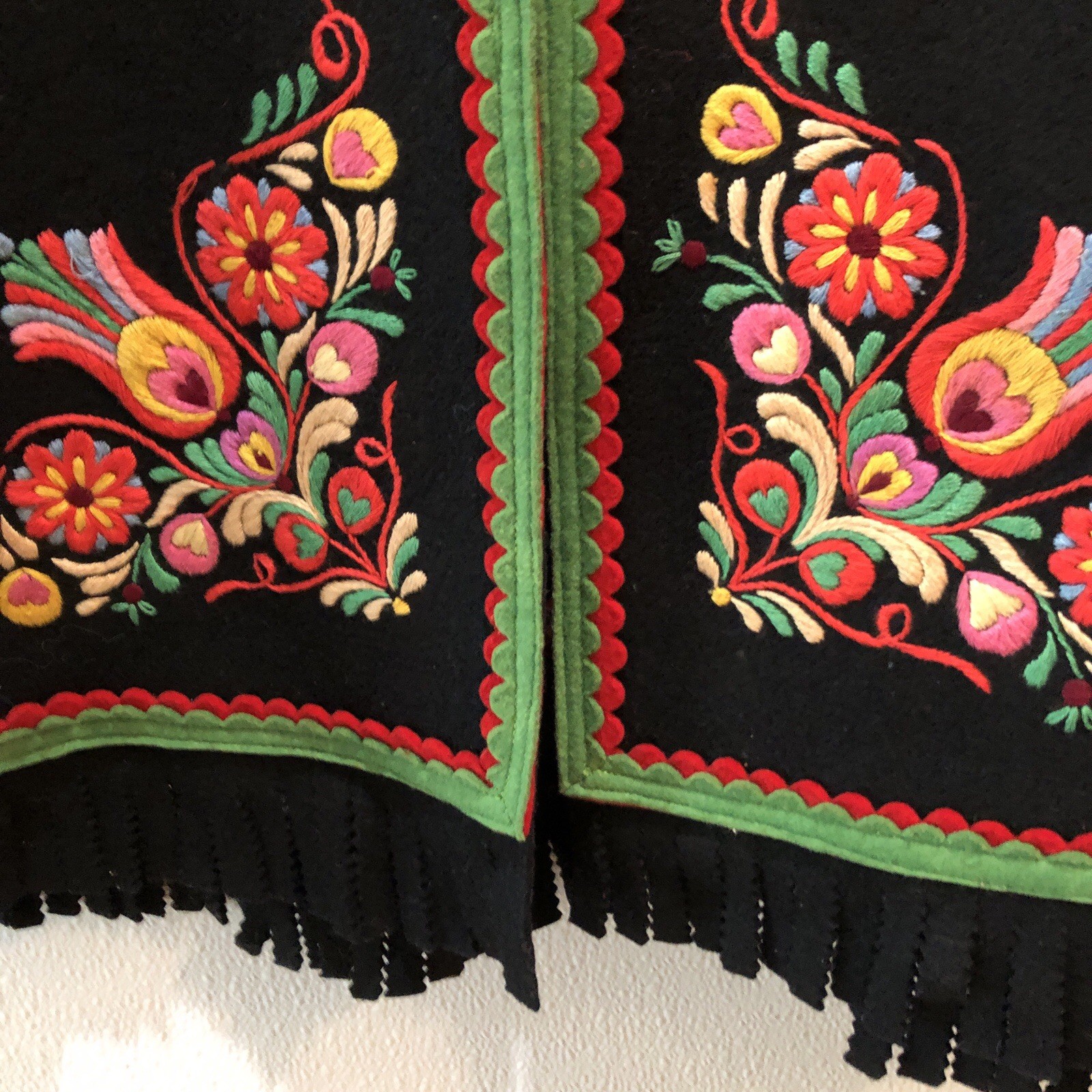 VTG Hungarian Hand Stitched Matyo Floral Embroidered Long Vest Black Felt Small