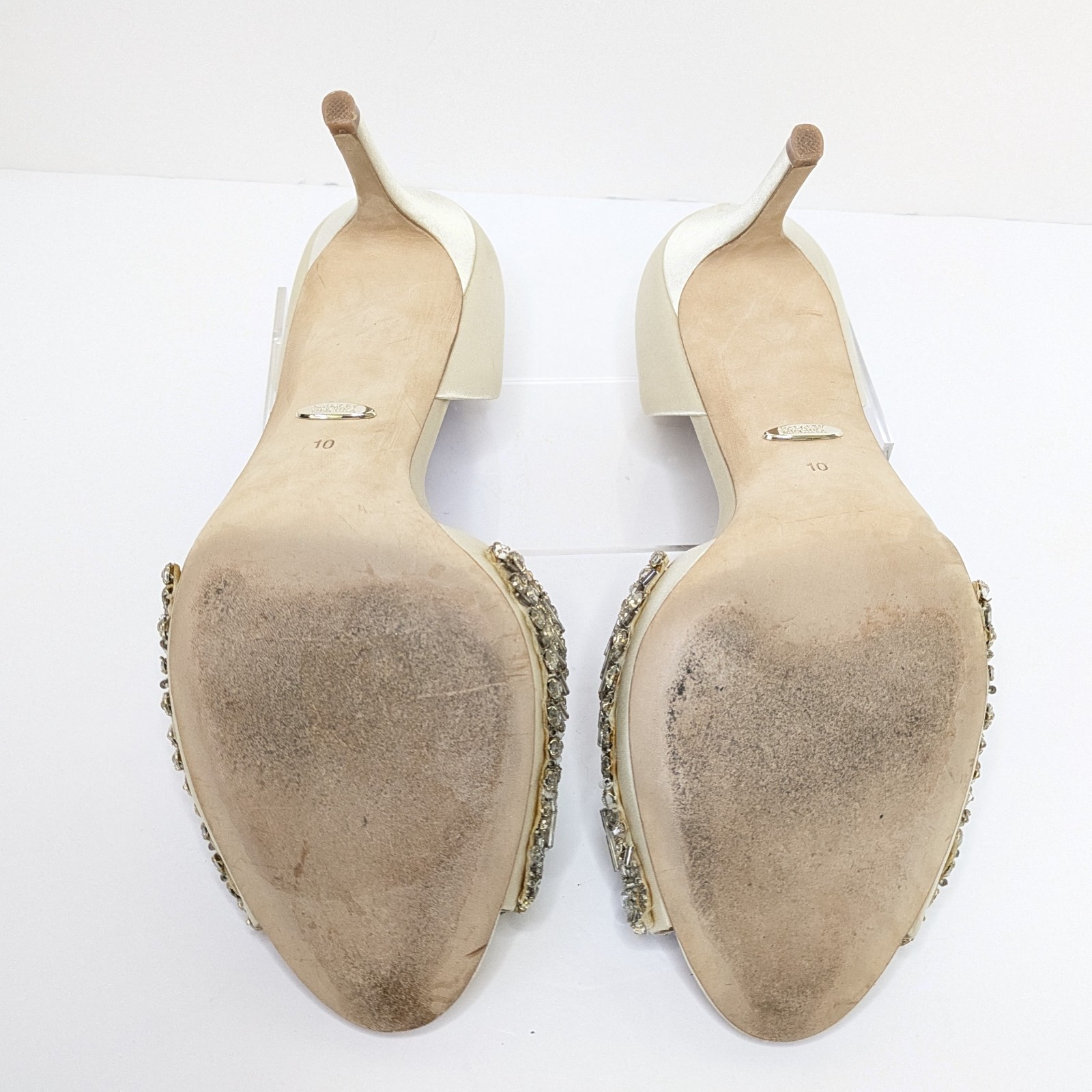 как выглядит Badgley Mischka Maria Ivory Satin Peep Toe Pumps Sz 10 Crystal Beaded Rhinestone фото