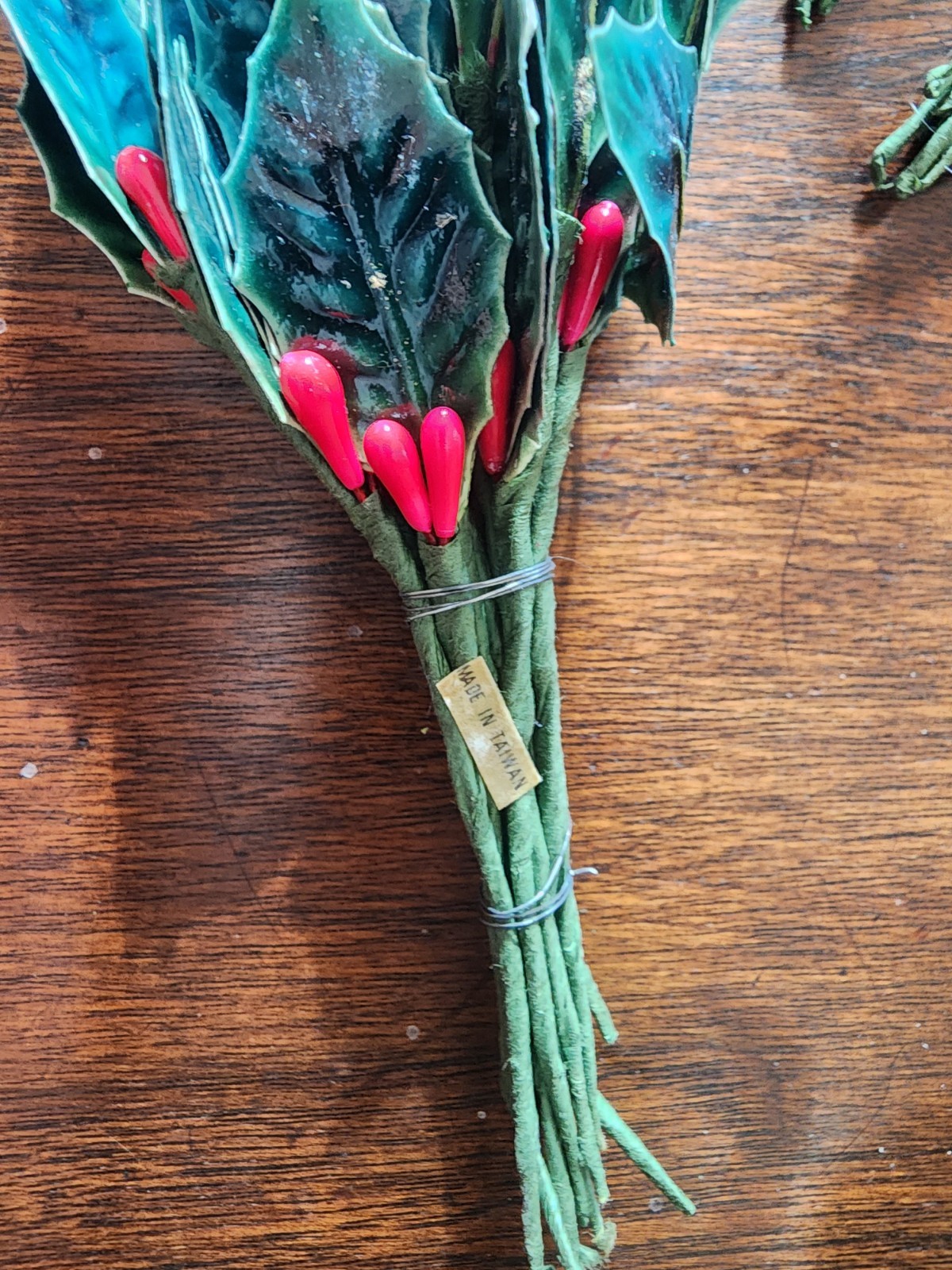 Vtg Lot 12 Lacquered Holly Leaves Red Berries Stem Picks Tie Ons Christmas