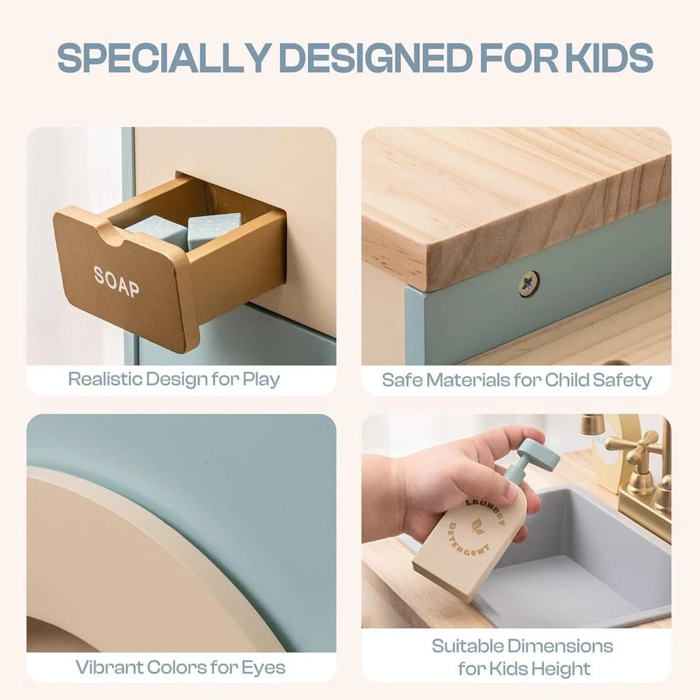 Toy Kitchen Washer Playset, Wooden Toy Washing Machine for Kids with Clothes ...