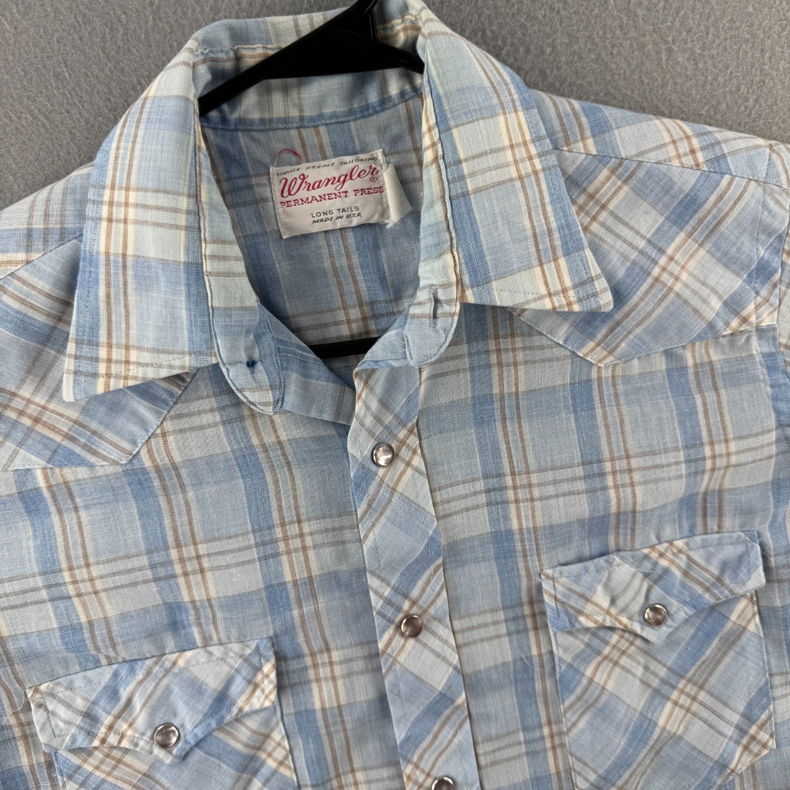Vintage 70s Wrangler Shirt Mens 15.5 Blue Plaid Pearl Snap Western Cowboy USA
