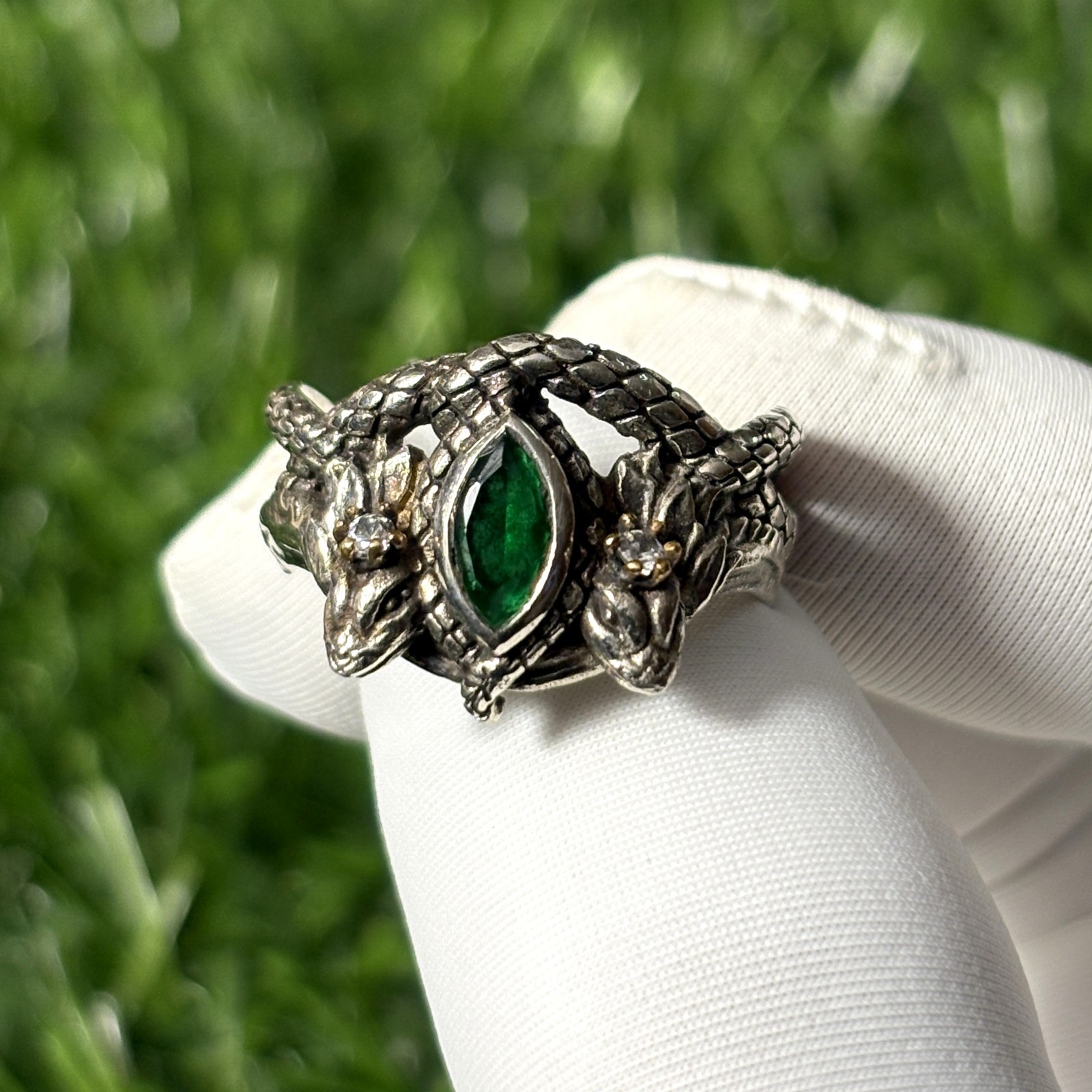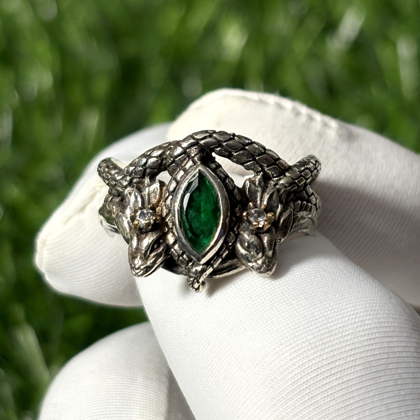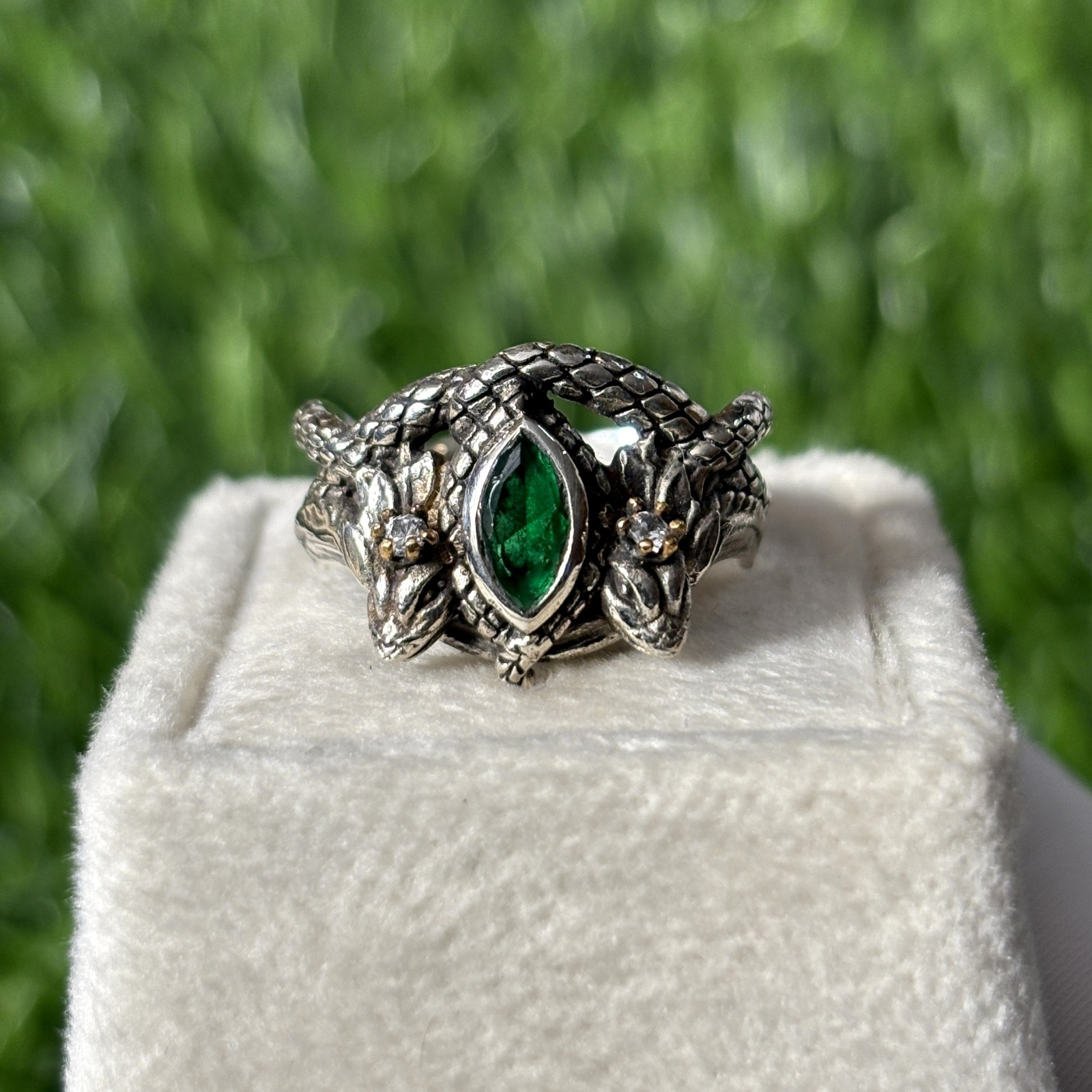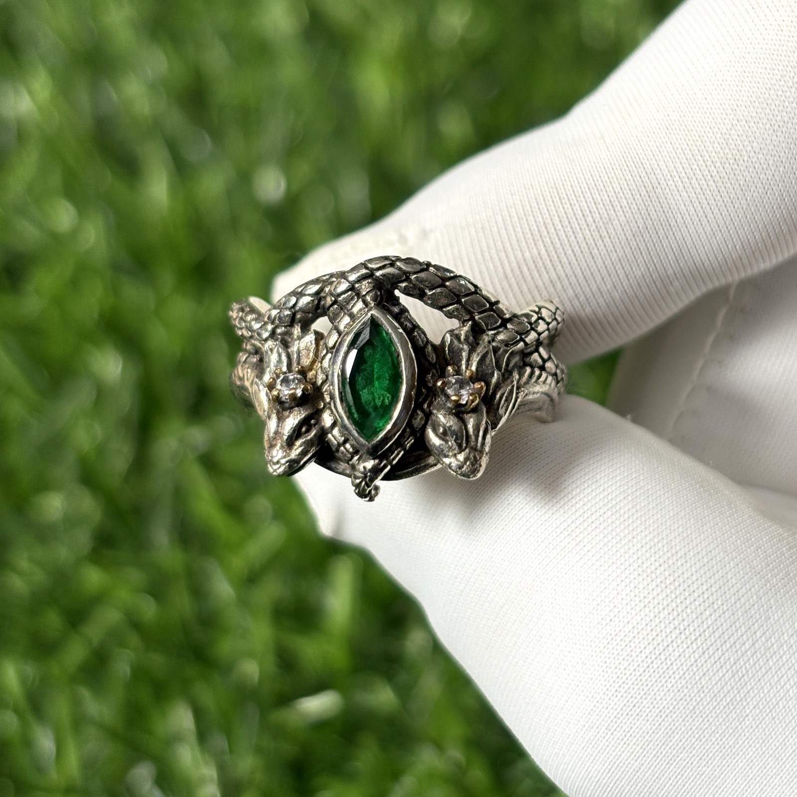 как выглядит Gothic Snake Ring oxidized Sterling Silver Green Marquise Stone Serpent Jewelry фото