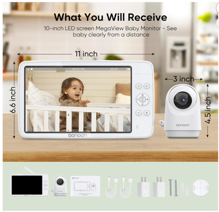 Bonoch Baby Monitor No WiFi 10 inch 720P with Camera and Audio