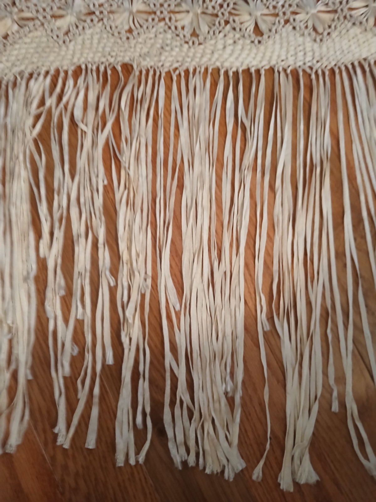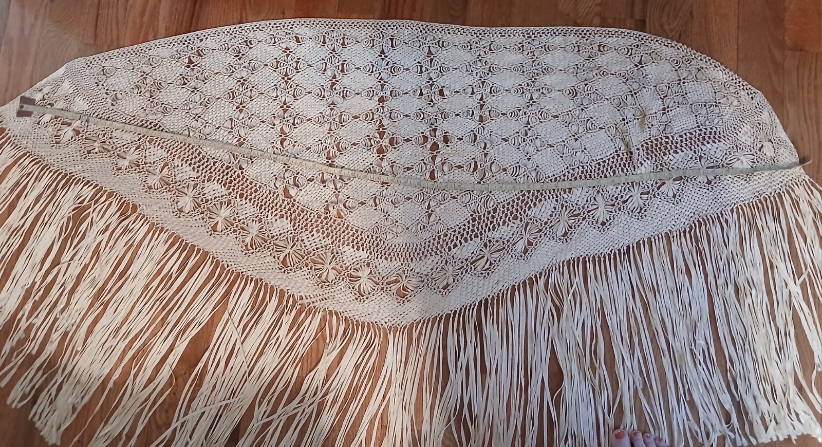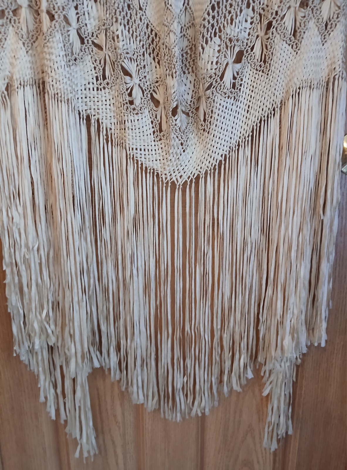 как выглядит Vintage 1920s-1960s Ivory Silky Floral Piano Shawl With Knotted Lace Fringe фото