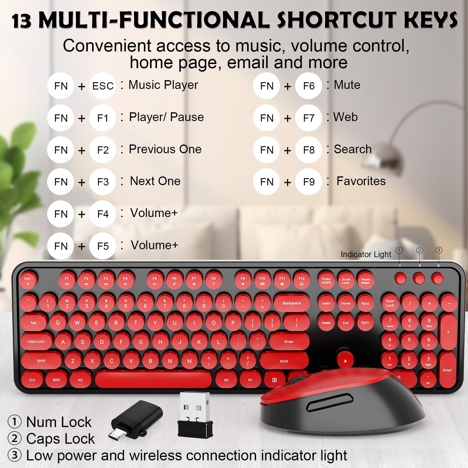 Wireless Keyboard, Mouse, Retro Typewriter, Round Keycaps, Black, Red, Full-Size