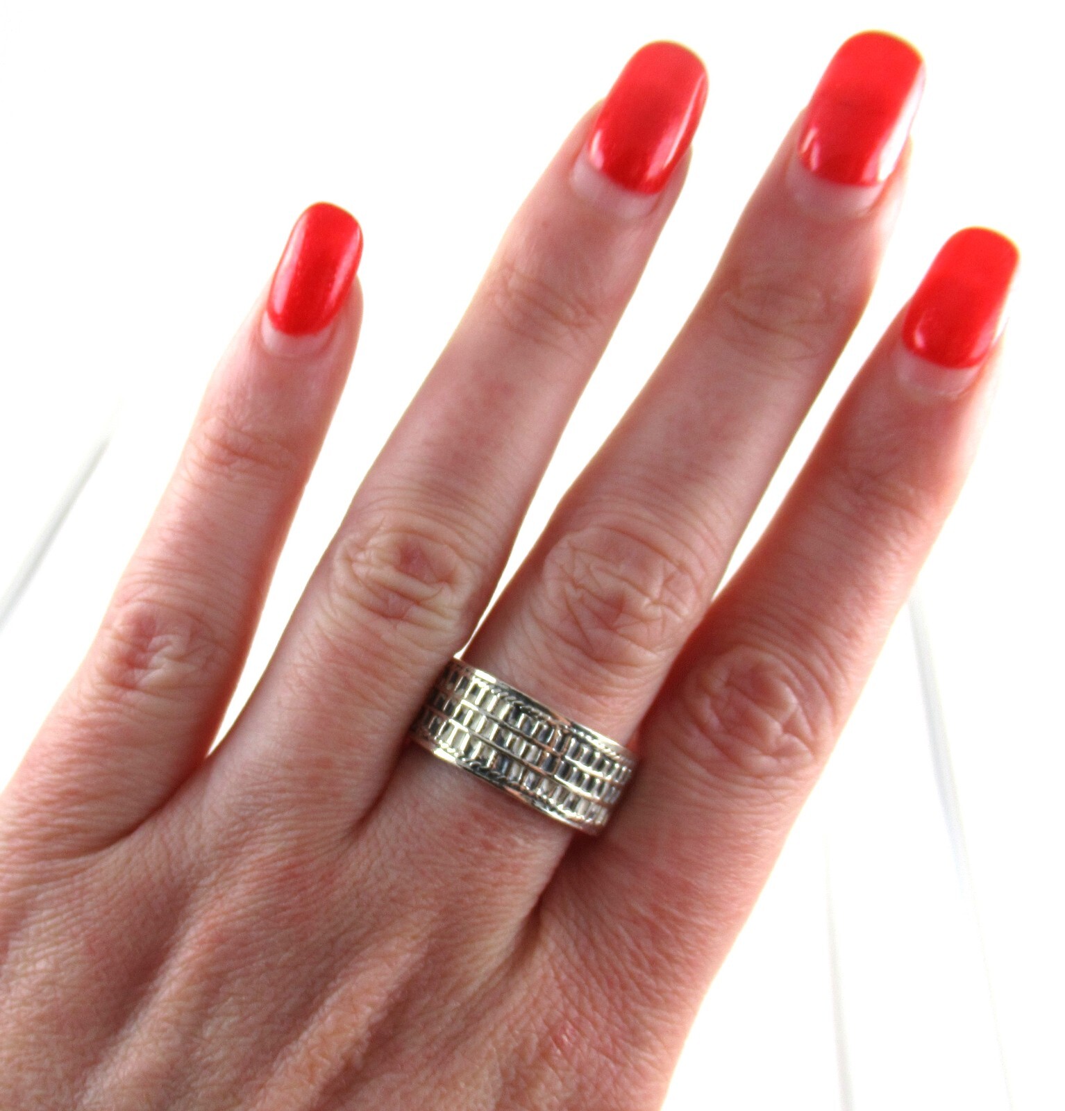 .925 Sterling Silver Ring Textured Wide Band Vintage Style Design sz 9.25