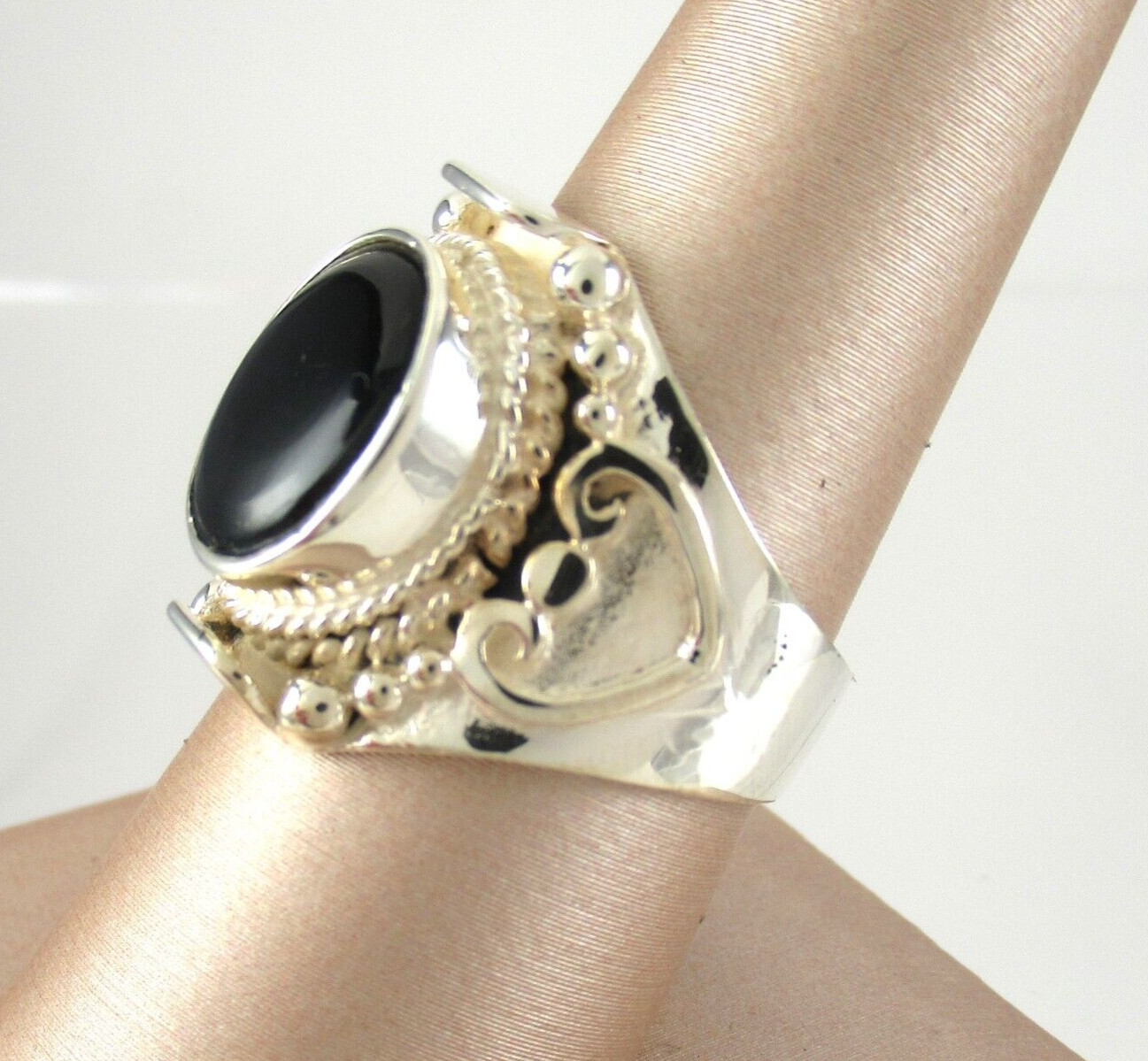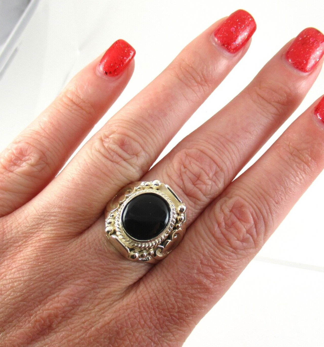 .925 Sterling Silver Black Onyx Statement Ring Ornate Setting sz 8.25 Boho