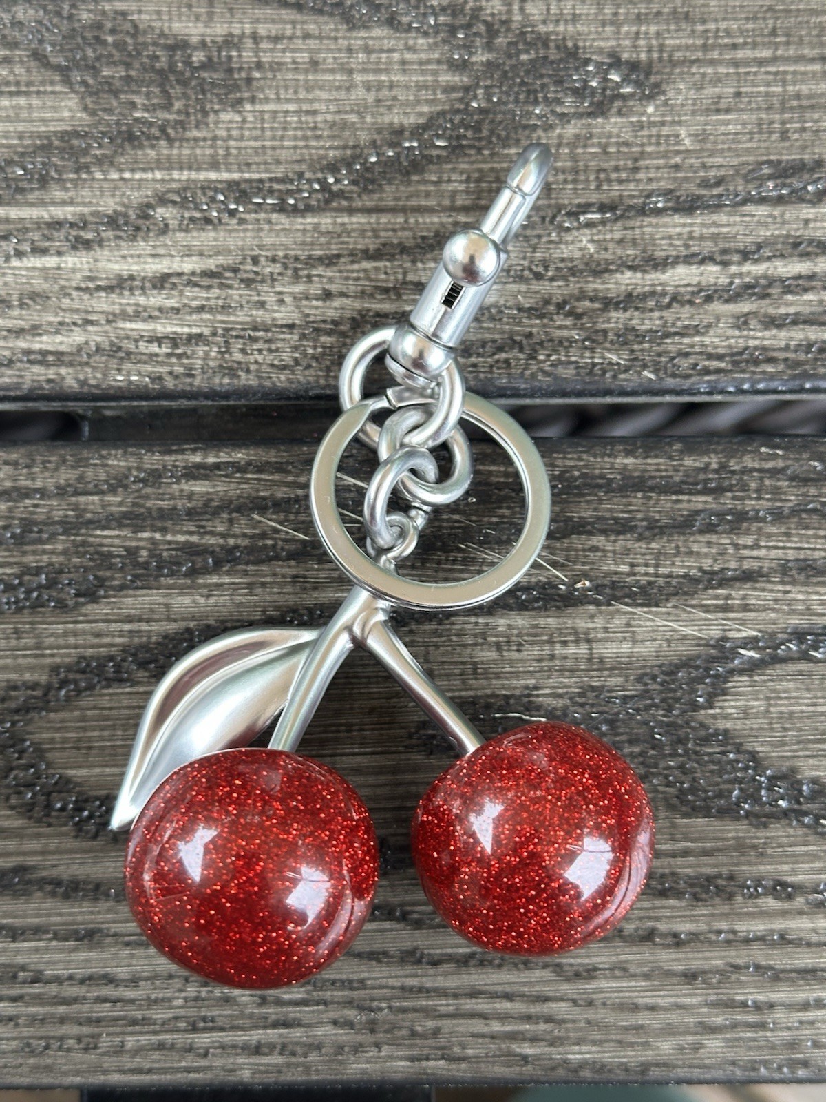 Glitter RED Cherry Bag Charm Keychain - Silver Metal Resin - USA Shipping