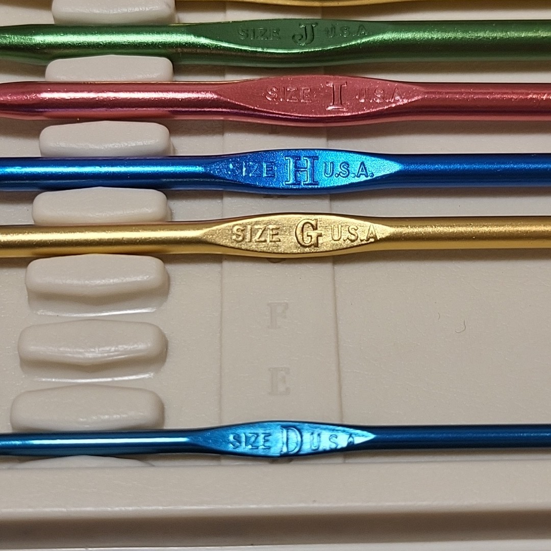как выглядит 6 Pc Boye Crochet Hook Set D G-K in Lidded Case Missing E-F Aluminum фото