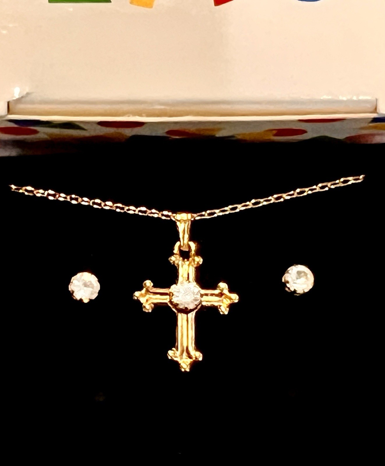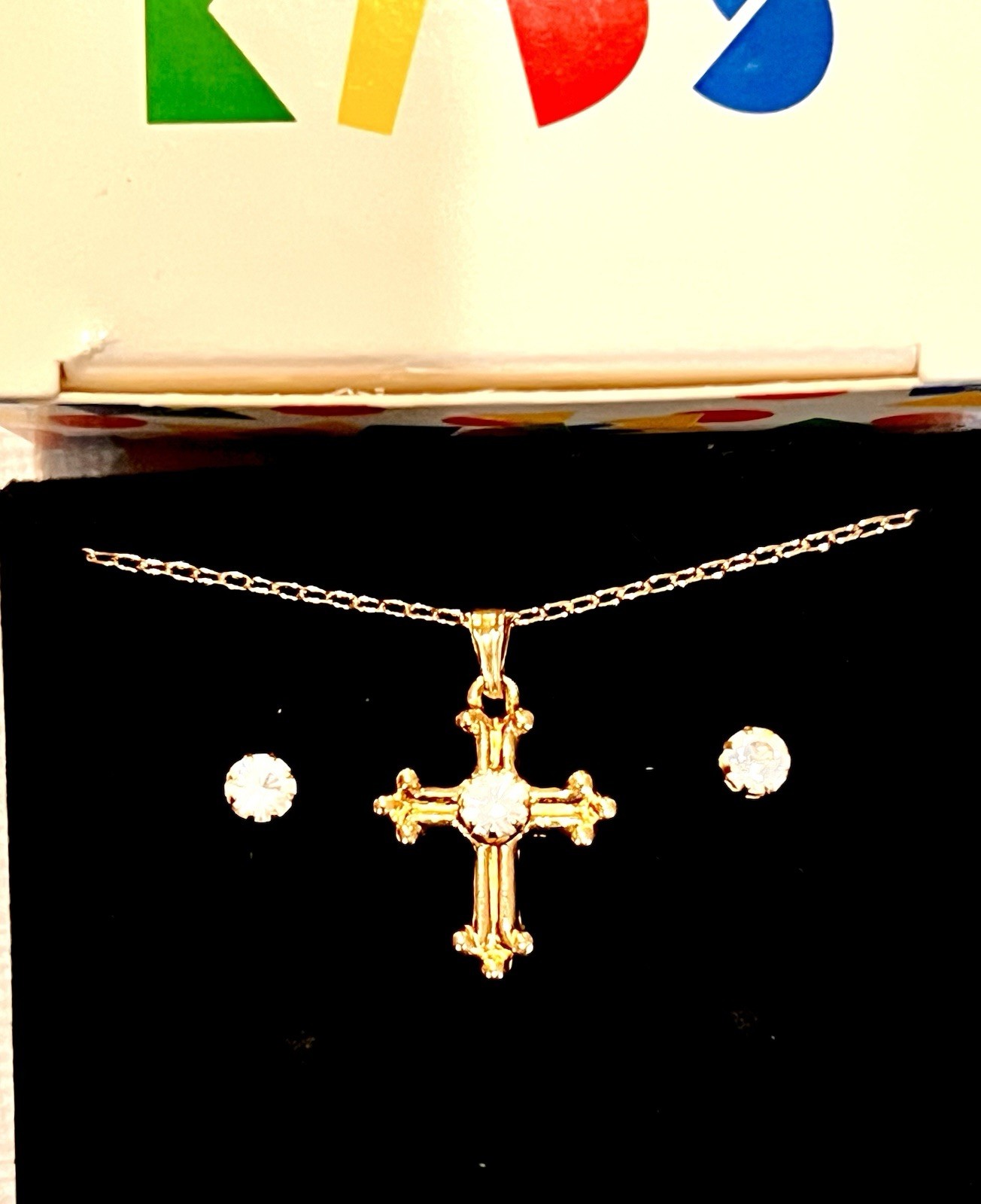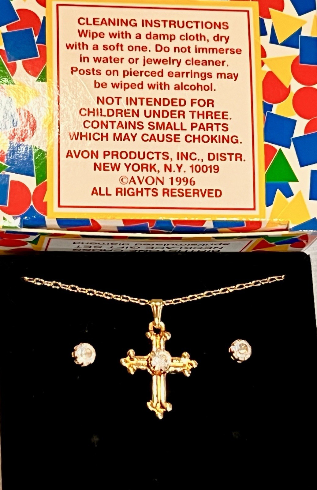 1996 Avon KIDS BIRTHSTONE CROSS GIFT SET NECKLACE Earring APRIL Sm Diamond NOS