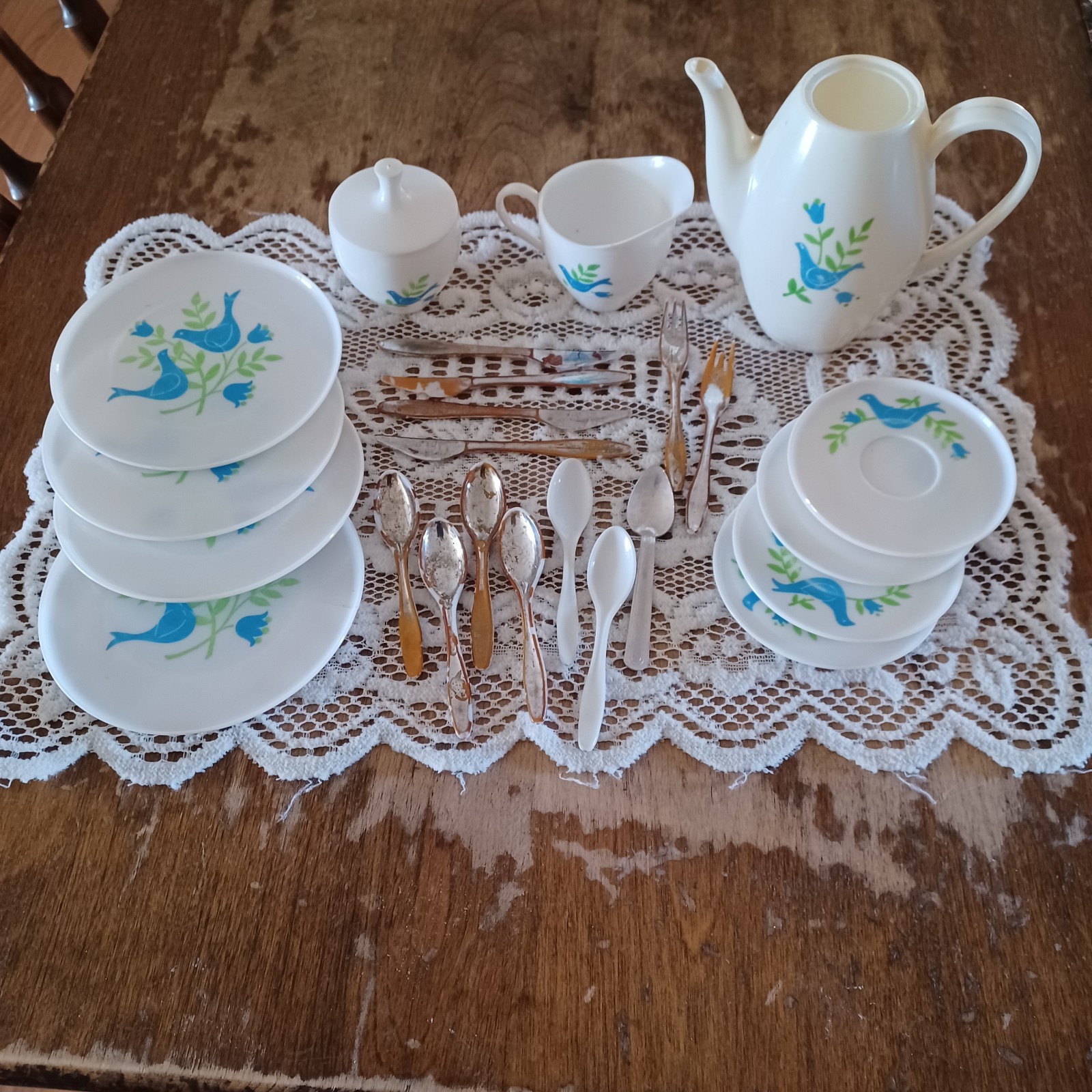 как выглядит Vintage Andy Gard Corp Plastic Toy Dishes Blue Floral Plates Pitcher Utensils фото