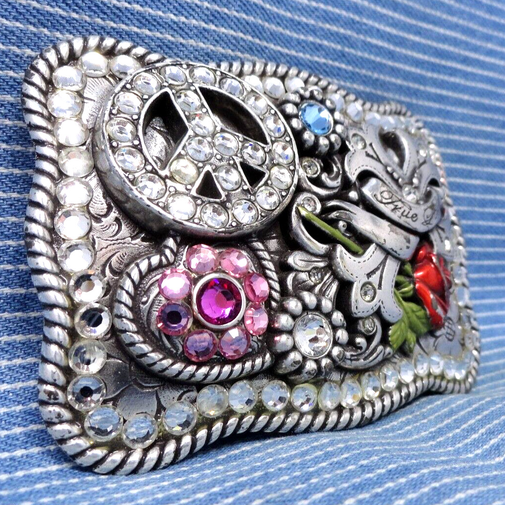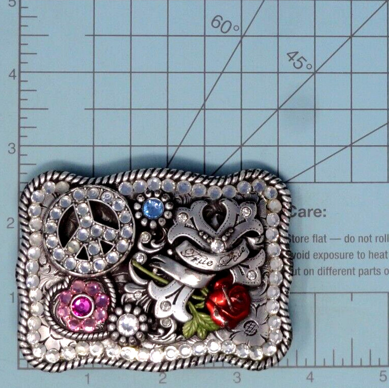Eclectic True Love Peace Cross Floral Belt Buckle Rhinestones Vtg Nocona .TYC194