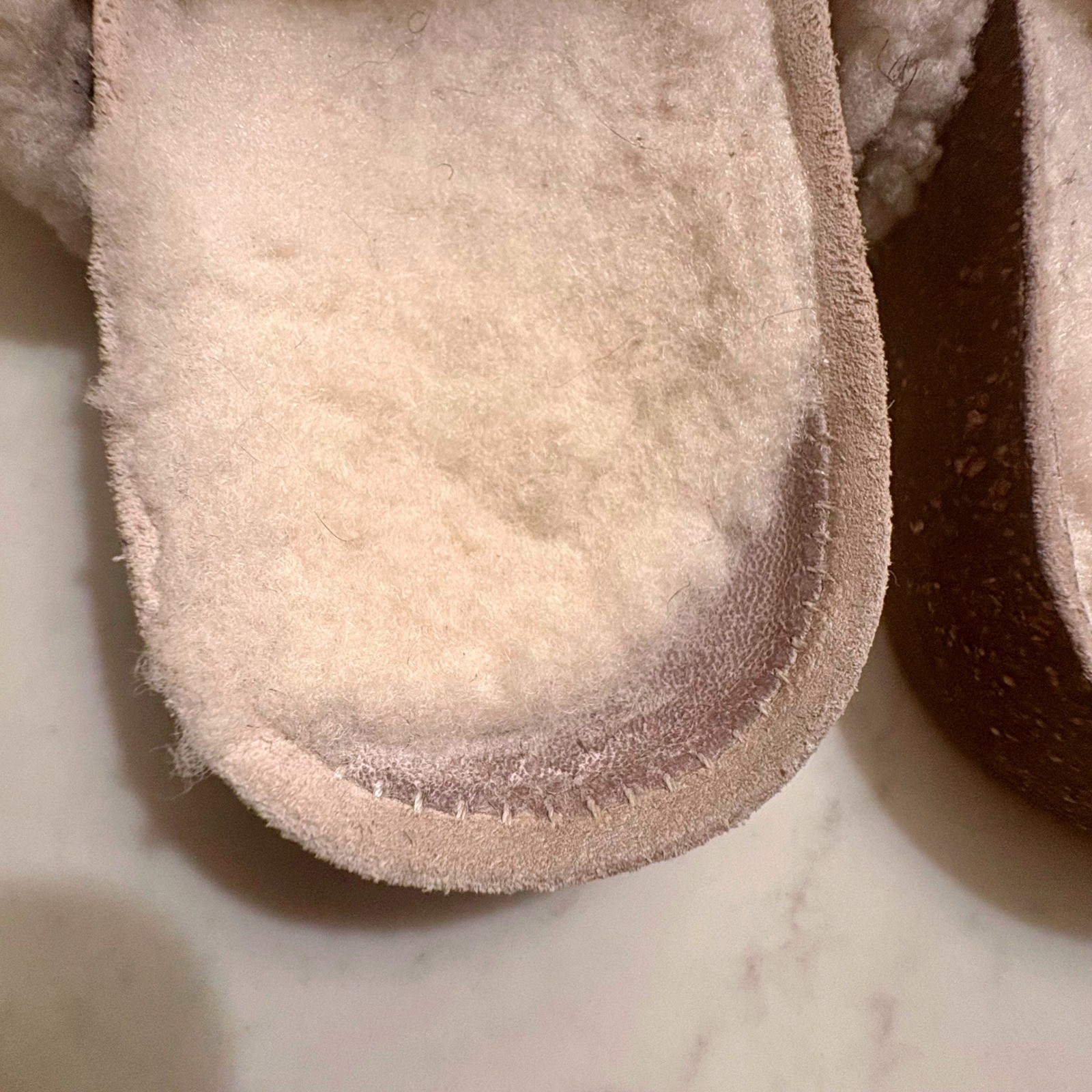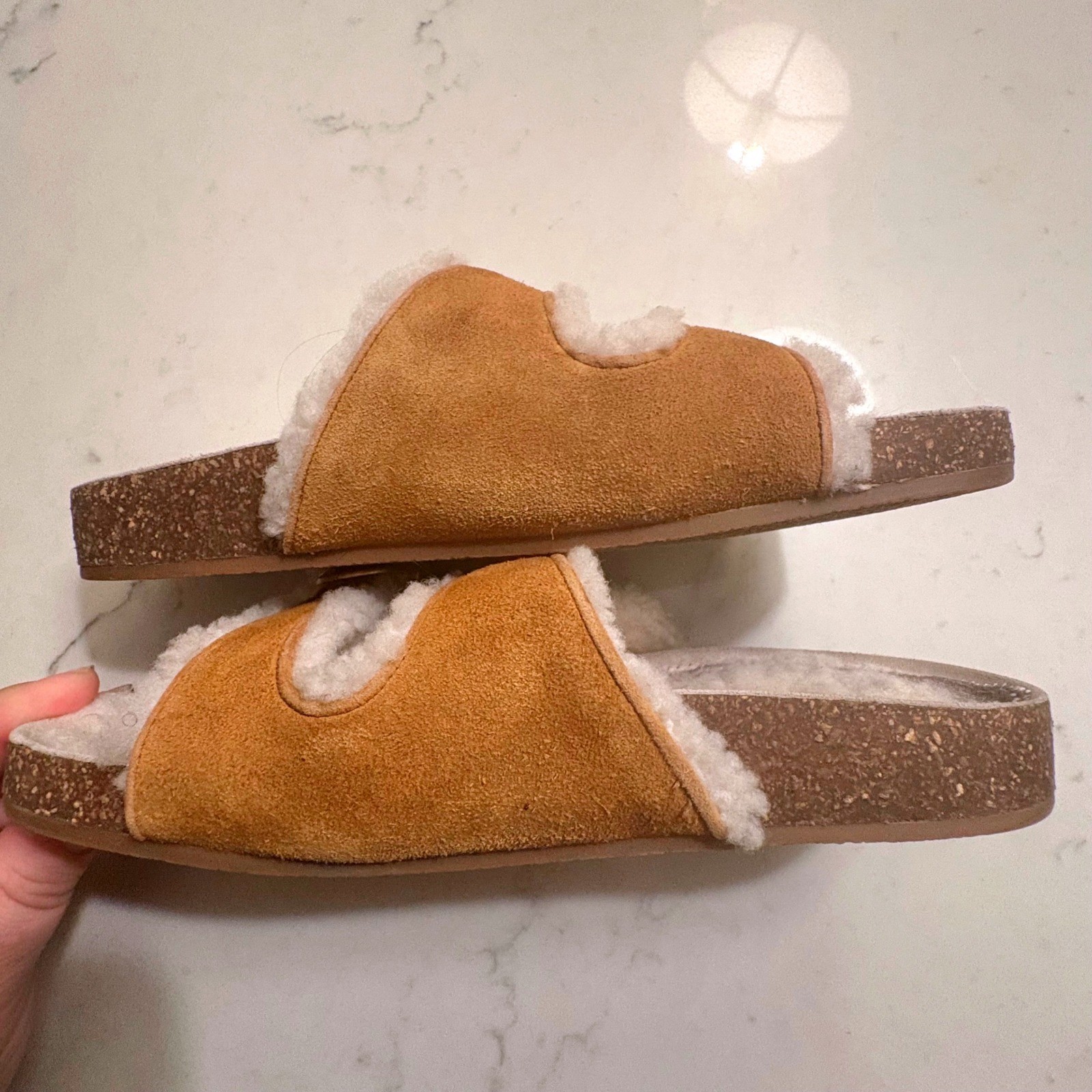 289 TORY BURCH Anatomic Shearling Lined Slides Tan Suede Gold Buckle Sz W5.5