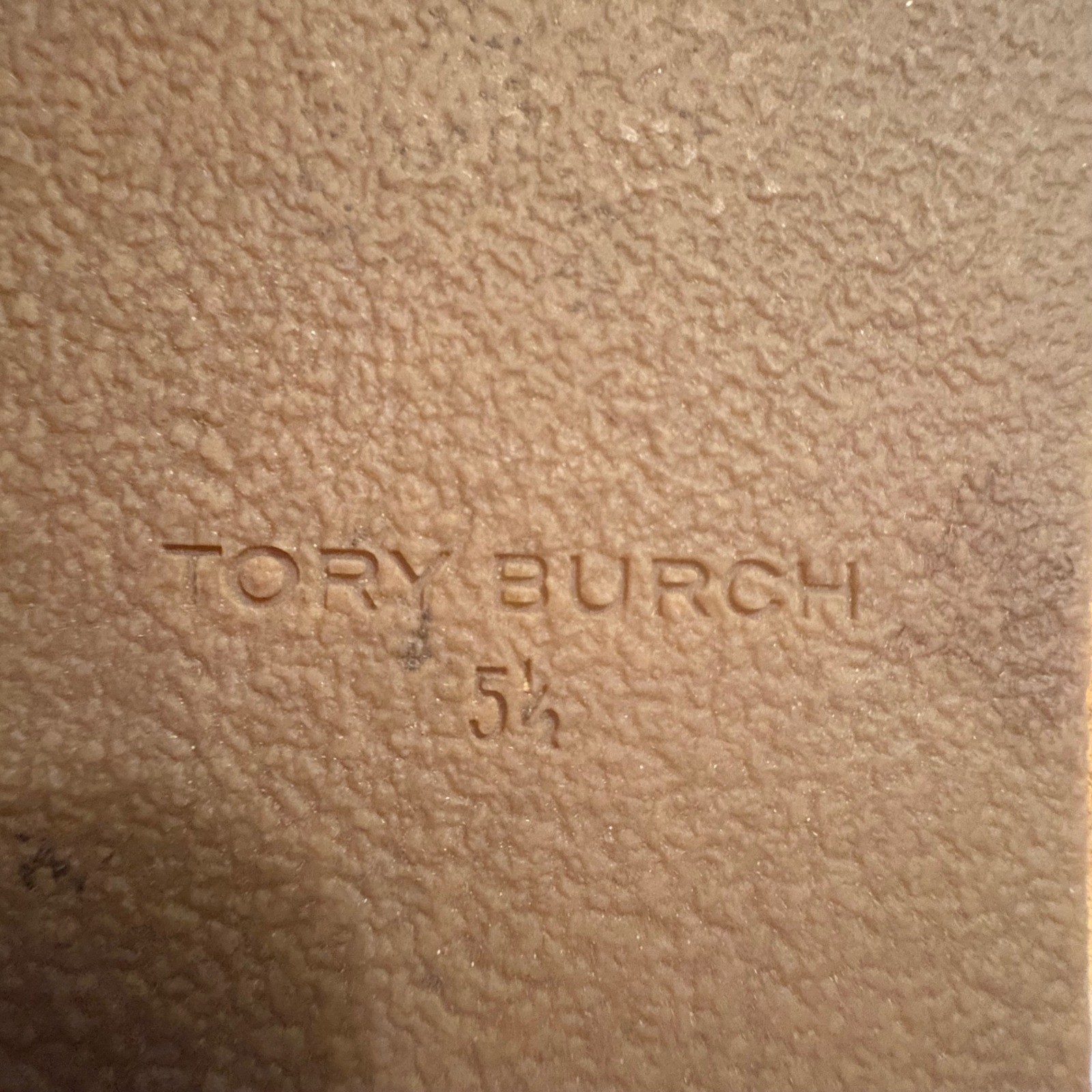как выглядит 289 TORY BURCH Anatomic Shearling Lined Slides Tan Suede Gold Buckle Sz W5.5 фото
