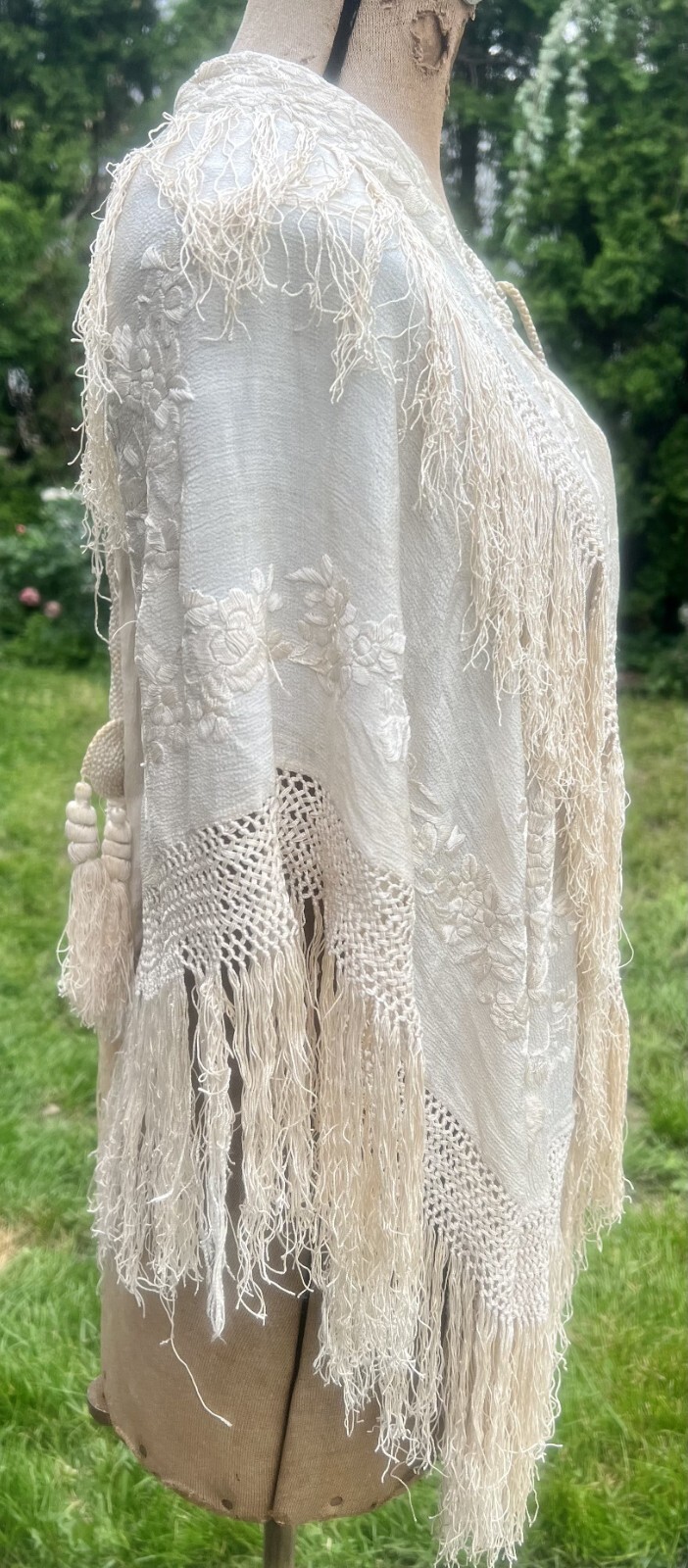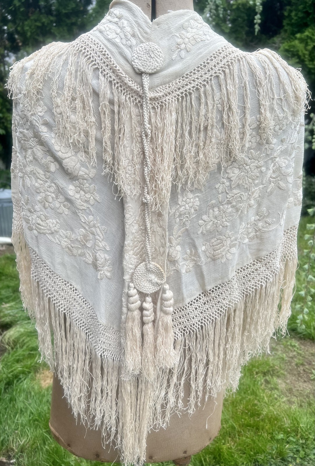 ANTIQUE VICTORIAN CREAM EMBROIDERED PIANO SHAWL CAPE TASSELS MUSEUM PIECE